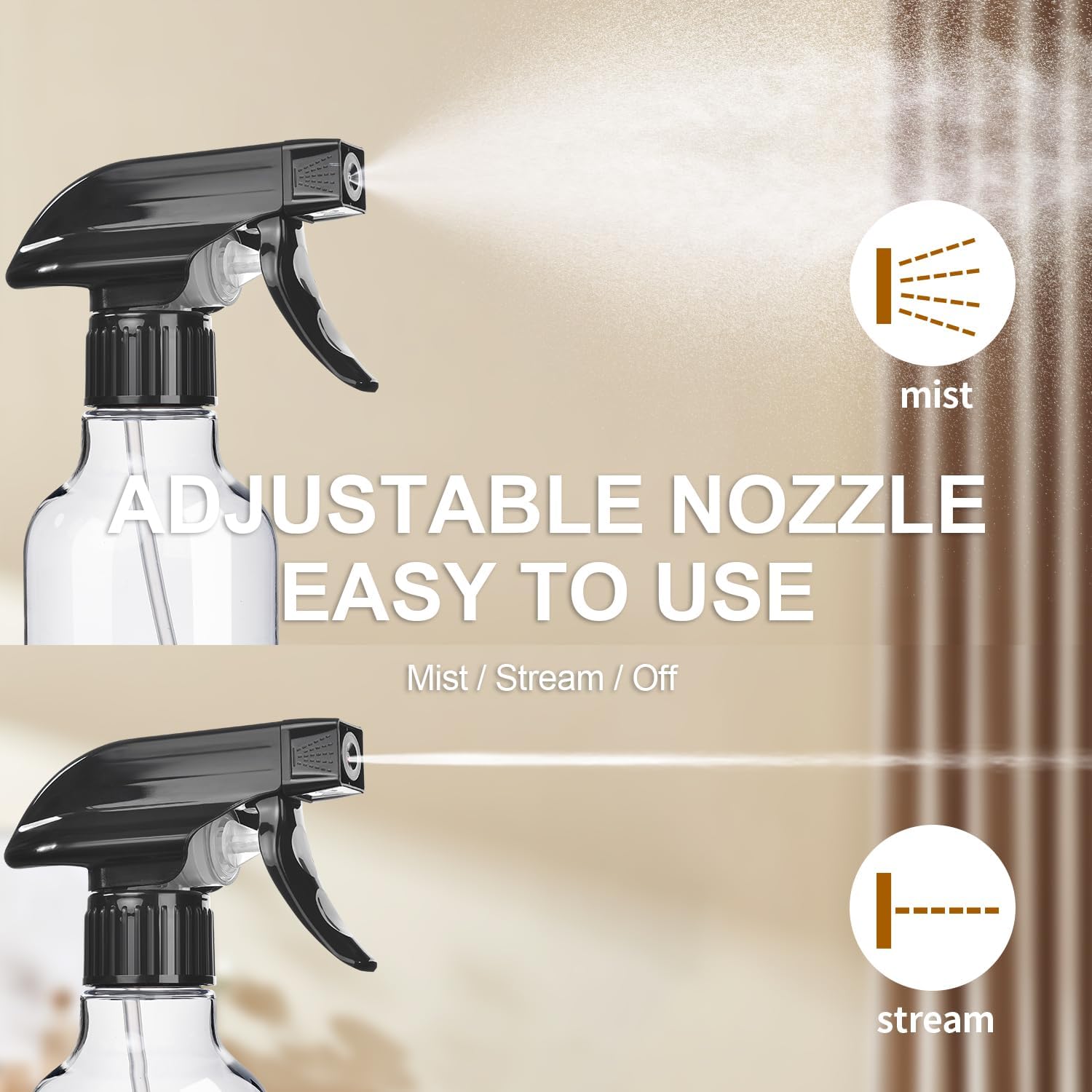 • 3 Modes (Fine Mist, Solid Stream & Turn Off) - Easy to hold and spray, these sprayer bottles feature a smooth nozzle adjustment for mist to stream. They deliver a gentle mist that won't harm delicate plants and a solid stream up to 10 feet, catering to different scenarios.