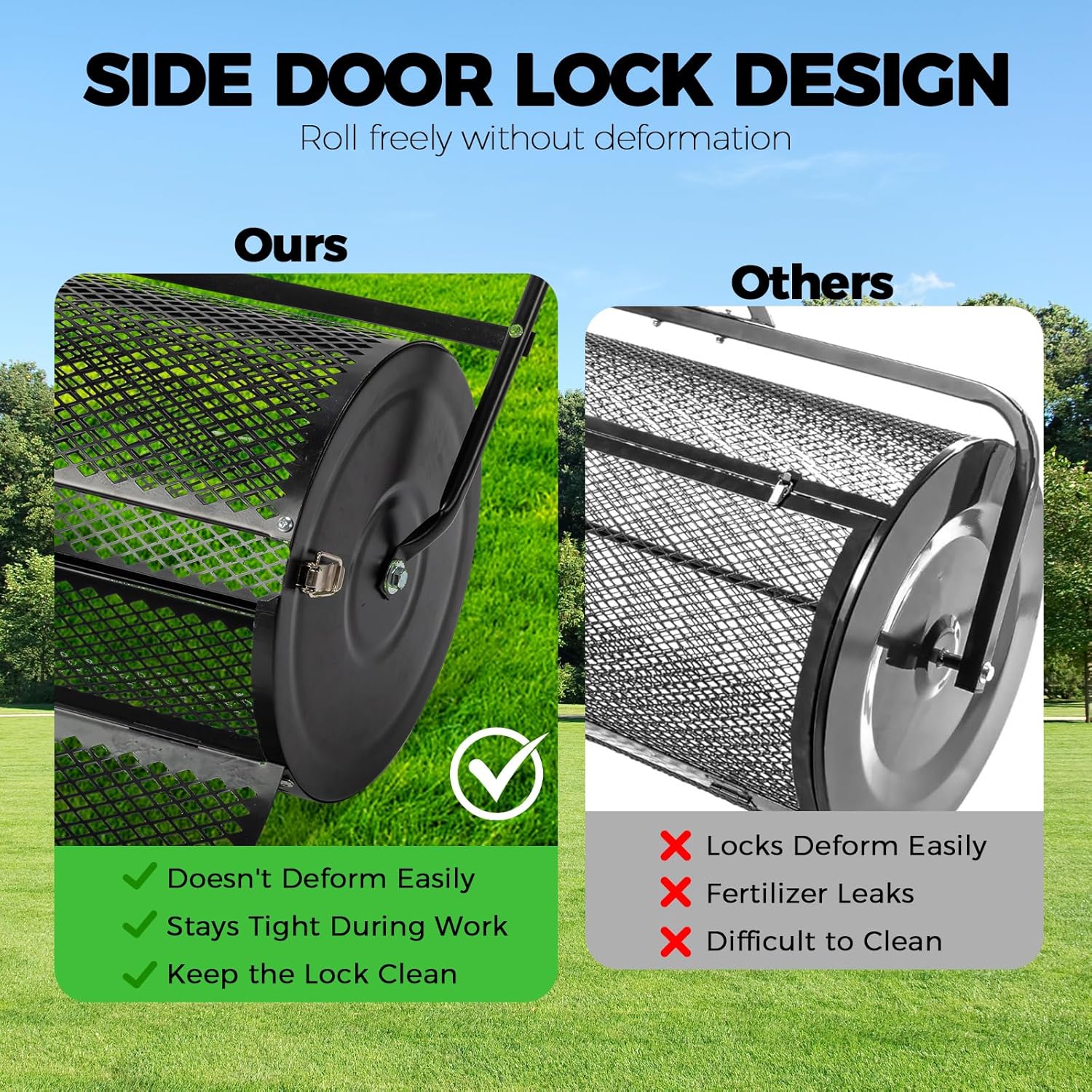 • Easy to Operate: The peat moss spreader is equipped with an upgraded hinge design that allows for a wider opening angle. The hinged soil roller door makes filling easy, while the lawn soil spreader side clasps secure the load