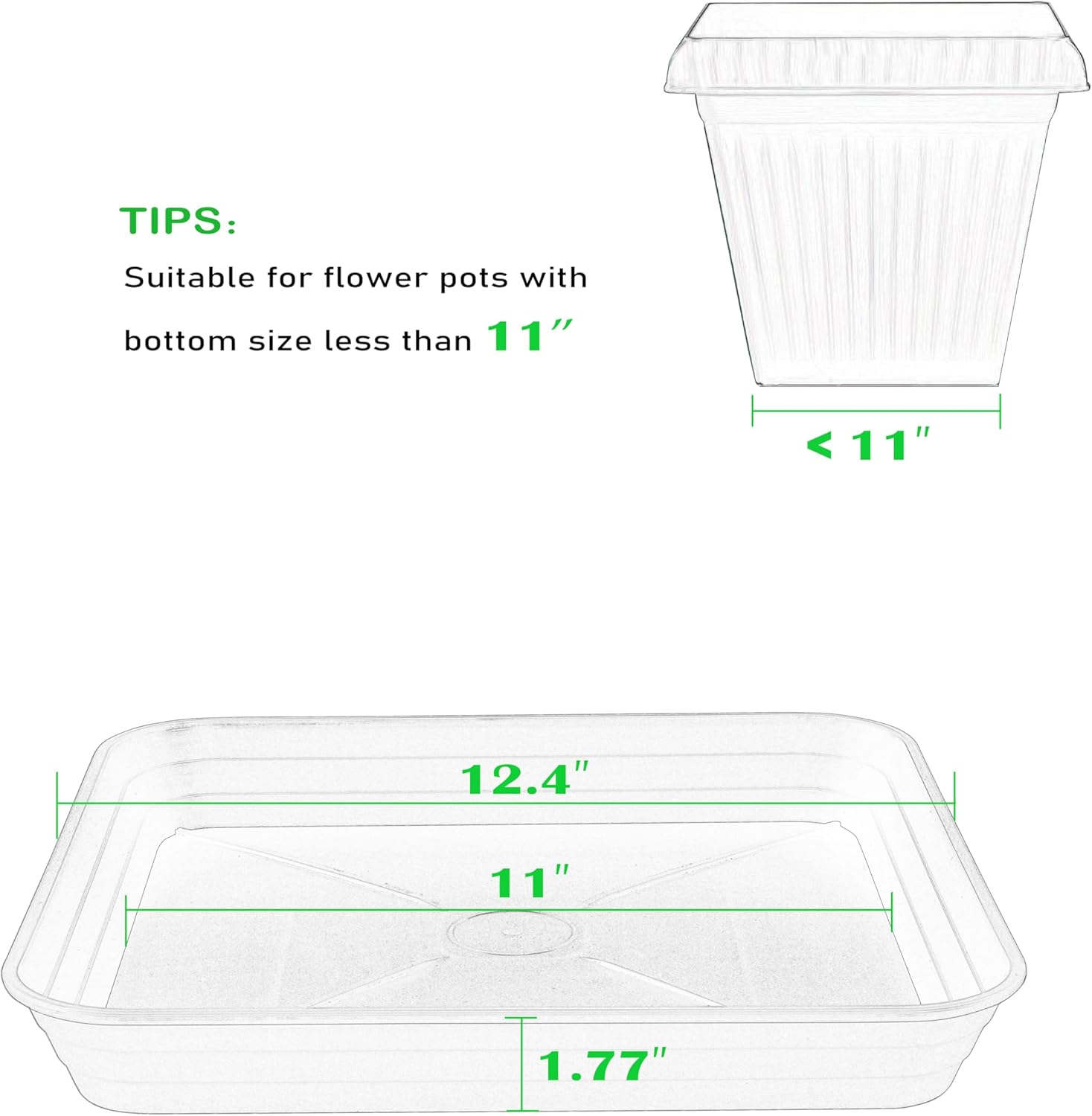 • Square Plant Tray Value: This 12 inch square plant saucer has a reasonable size design. The outer edge of the top is 12.4 inches Length, the bottom width is 11 inches, and the height is 1.8 inches. Square plant trays are suitable for planters