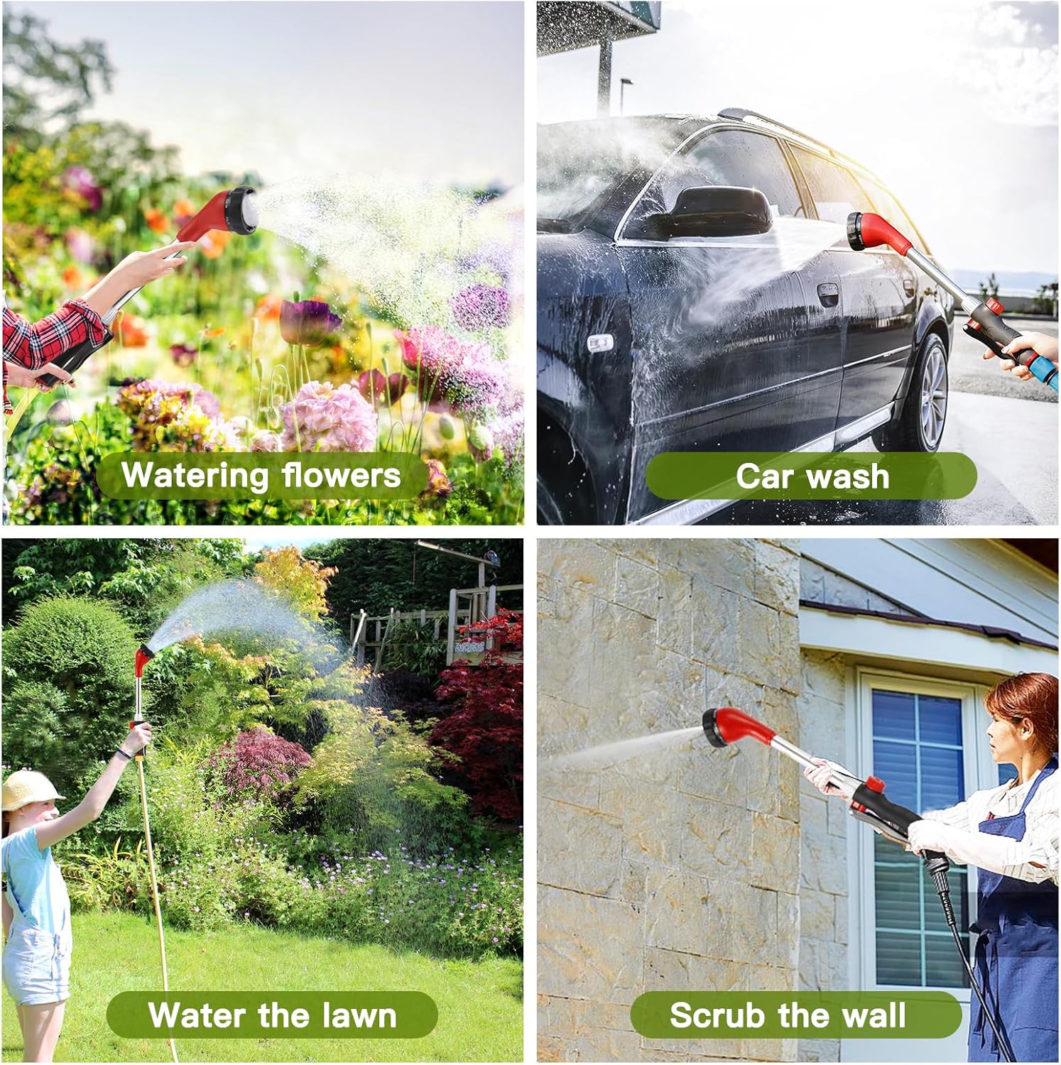 • Adjustable Sprayer Patterns. GREEN MOUNT garden hose wand has 8 adjustable watering patterns: Jet, Angled, Full, Soaker, Mist, Flat, Cone and Shower. Use the 'flat' to pressure wash the debris off the patio, the 'jet' to water things across the yard, the 'soaker' to water potted plants, the 'shower' to water the lawn, the ‘mist’ to water flowerbeds and seedbeds. This spray wand does the entire garden effortlessly
