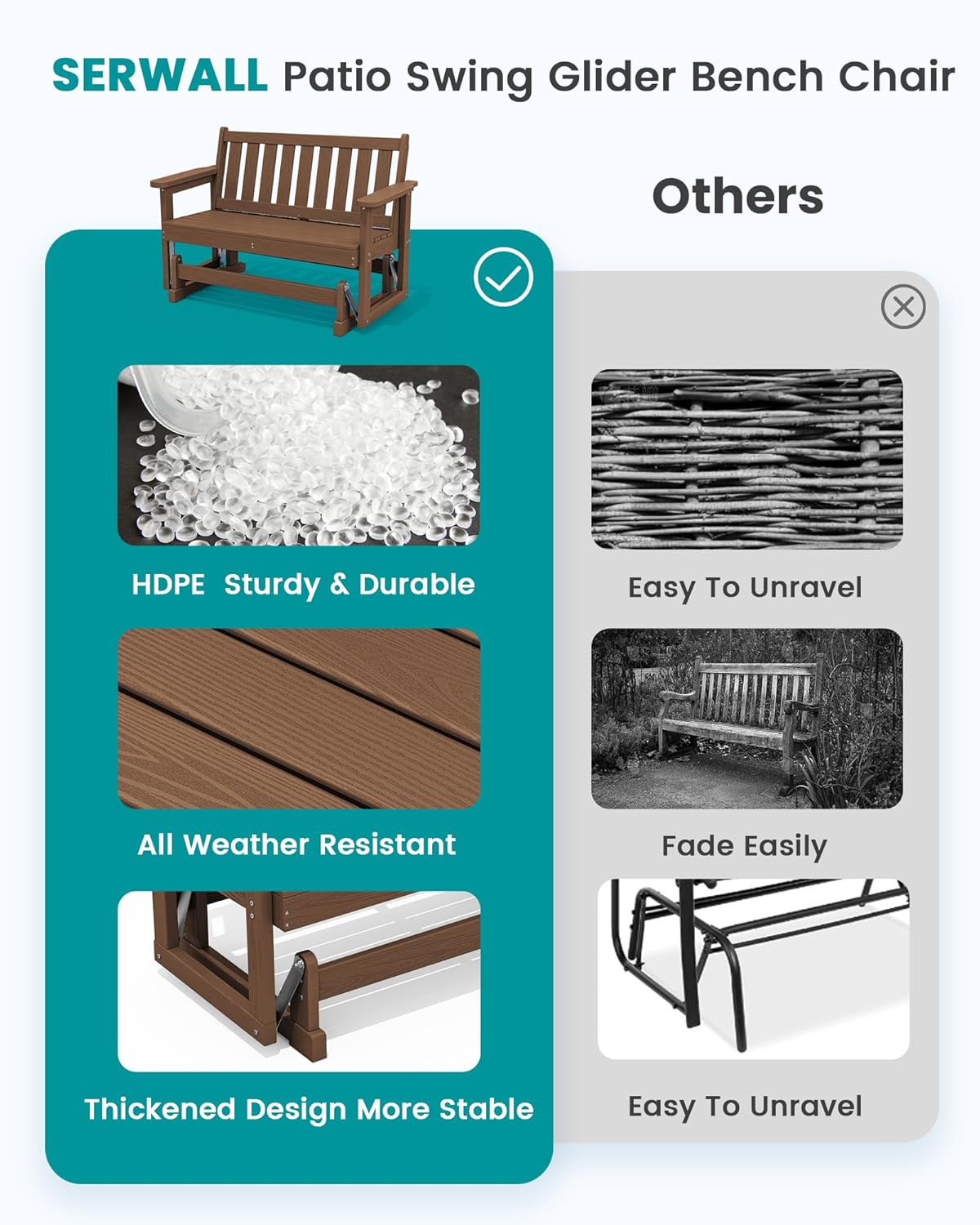 • [Outdoor Comfort] SERWALL outdoor swing chairs feature a unique wood-like texture, adding a touch of natural beauty to your space. Enjoy the fresh air and sunshine in comfort with this outdoor glider bench, create your outdoor relaxation paradise.