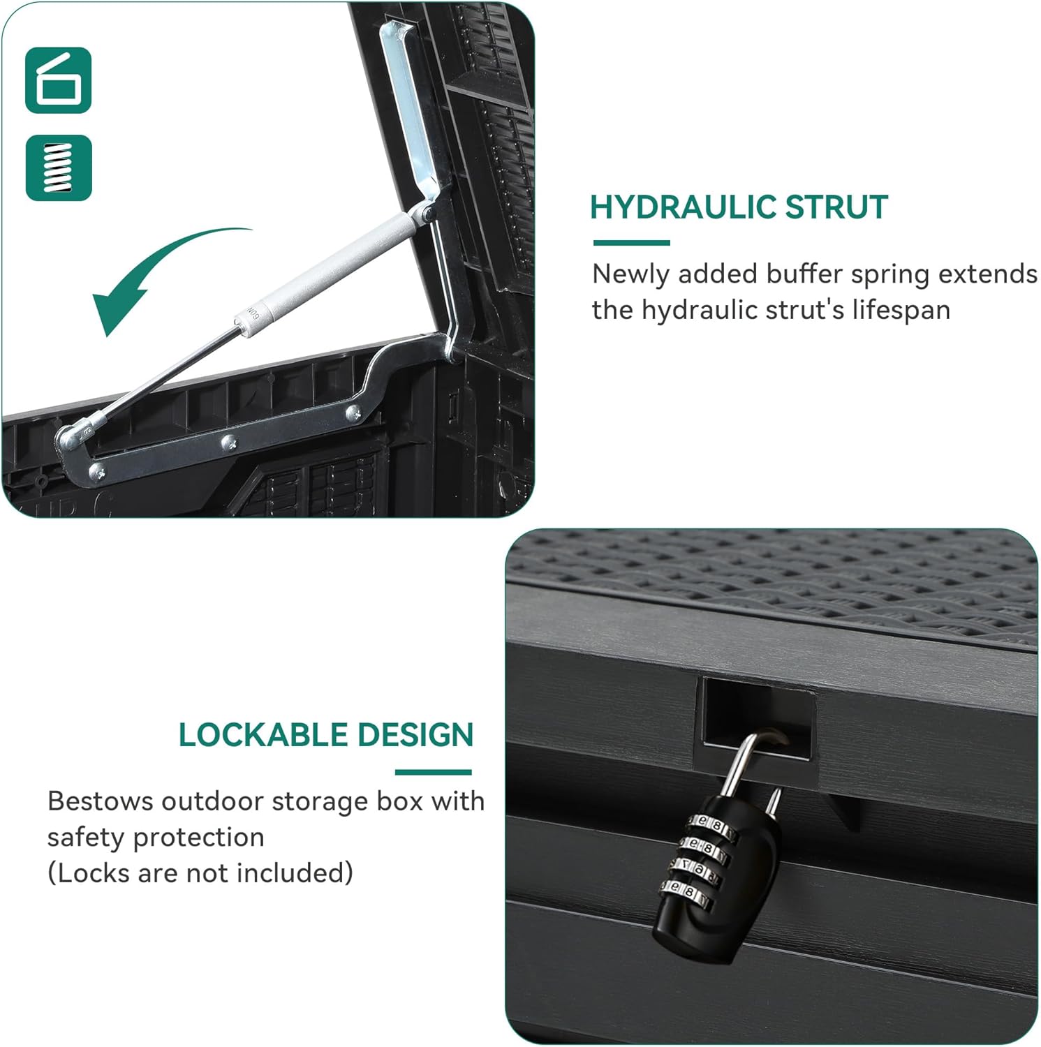 • Built to Last: Crafted from weather-resistant resin, these outdoor deck boxes are waterproof, rust-proof, UV-resistant, and fade-proof, making them ideal for long-term outdoor use in various climate conditions