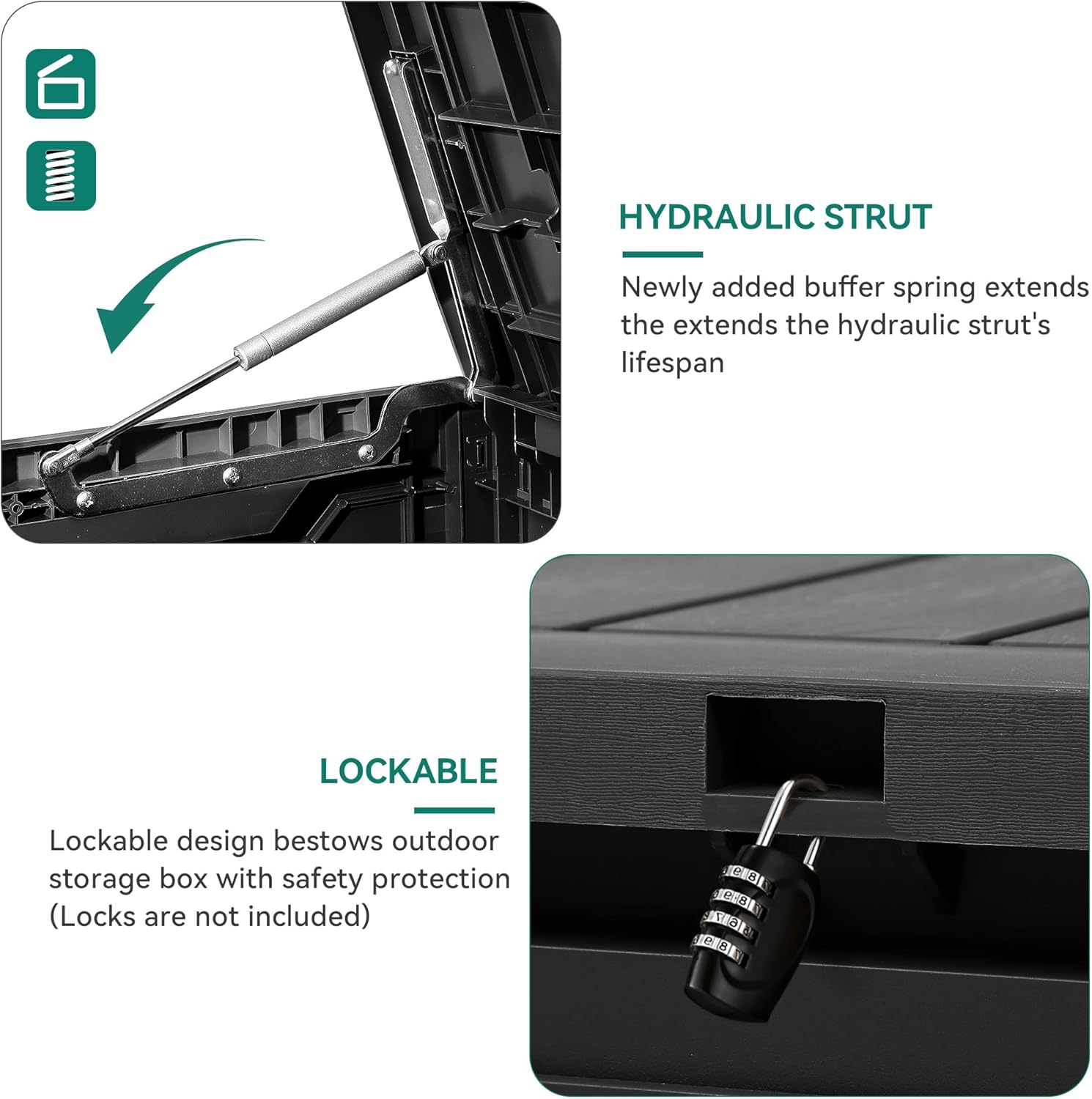 • Built to Last: Crafted from weather-resistant resin, these outdoor deck boxes are waterproof, rust-proof, UV-resistant, and fade-proof, making them ideal for long-term outdoor use in various climate conditions