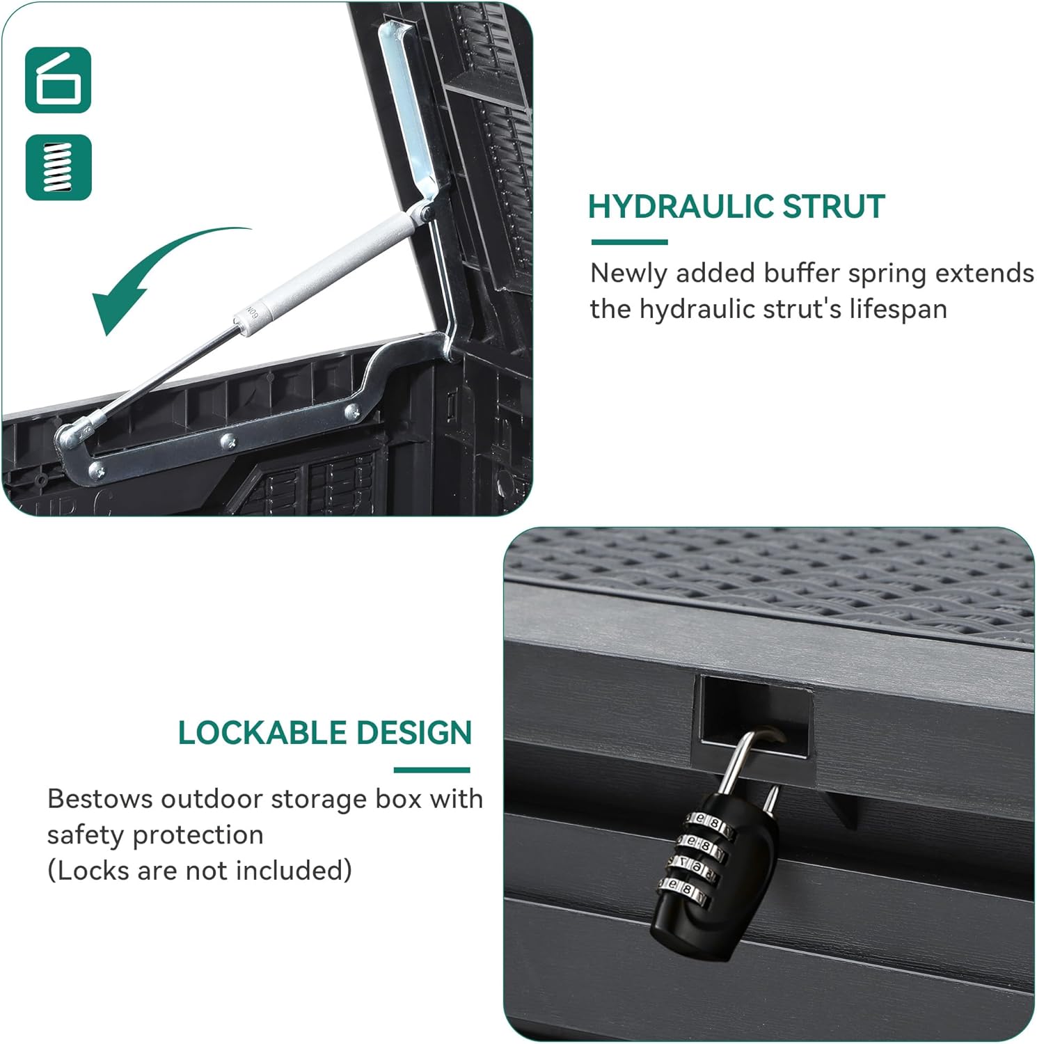 • Built to Last: Crafted from weather-resistant resin, these outdoor deck boxes are waterproof, rust-proof, UV-resistant, and fade-proof, making them ideal for long-term outdoor use in various climate conditions