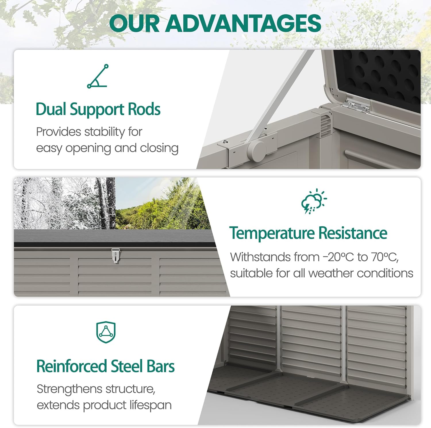 • Weatherproof Material: This outdoor waterproof deck box crafted from high-density eco-friendly resin with a realistic wood-grain finish, fully waterproof, UV-resistant, and built to resist rust, peeling, and warping. It stays dry even in heavy rain, outperforms wooden boxes against rot and iron against rust, and retains its look for 3-5 years with almost no upkeep