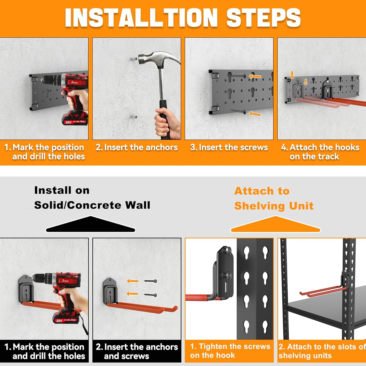 • Customizable and Easy Installation: Our tools rack includes 4 separate tracks and 4 mini plates, allowing you to arrange them to fit your garage space. Installation is simple with pre-aligned holes for easy mounting on 16" studs