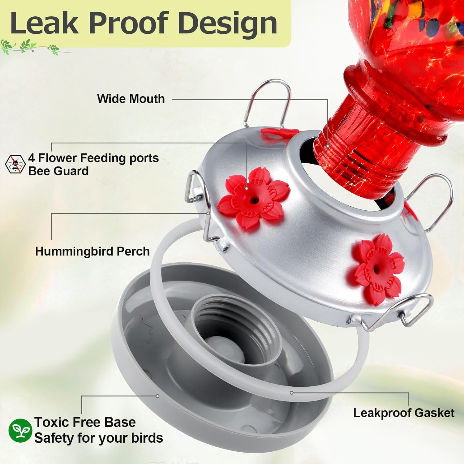 • Attract More Hummingbirds: XAROO hand-blown glass hummingbird feeder has bright and vibrant colors, effortlessly attracting surrounding hummingbirds to your yard. 4 feeding ports provide habitats for multiple hummingbirds