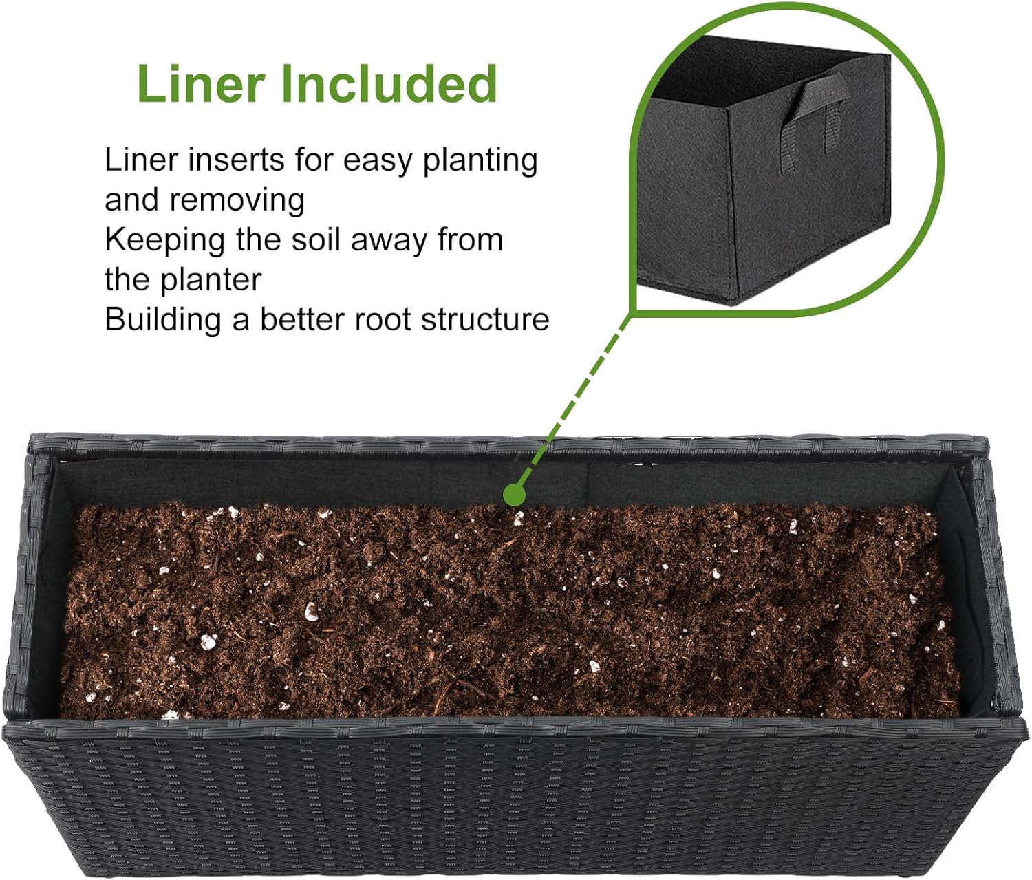 • Removable Liner: Each wicker planter comes with a nonwoven fabric liner (measures 29 x 10 x 10 inch) that separates wicker from the soil. Keep planter in excellent condition to prevent weeds and other invasive species from interfering with plant growth