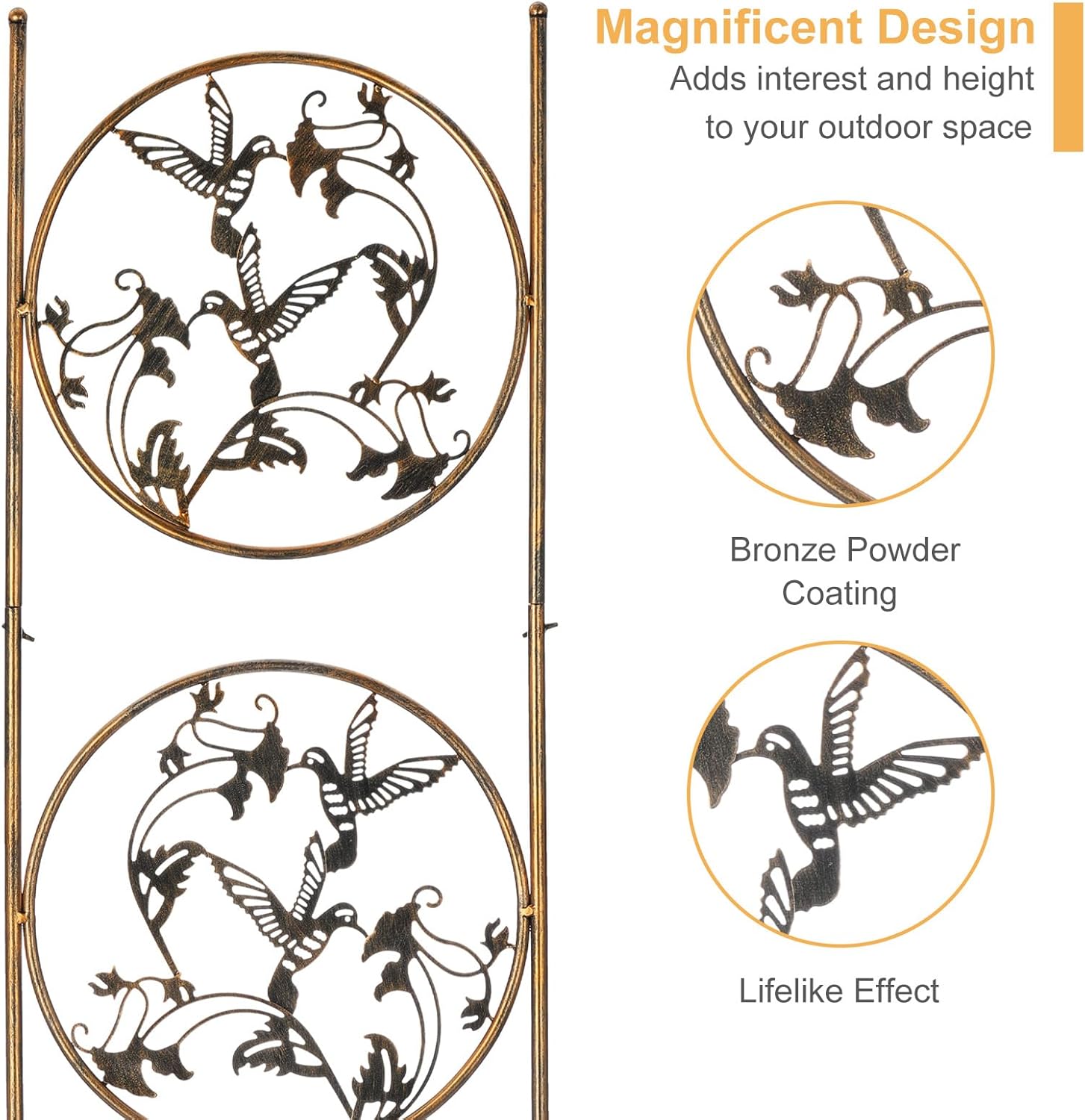 • Garden Decor: This pair trellis features 6 lifelike hummingbirds perch on the cattails with bronze powder coating, and it comes with ornate leaf curling design which encourages your climbing vines and flowers to flourish. Hummingbird wings are finished with a lifelike effect