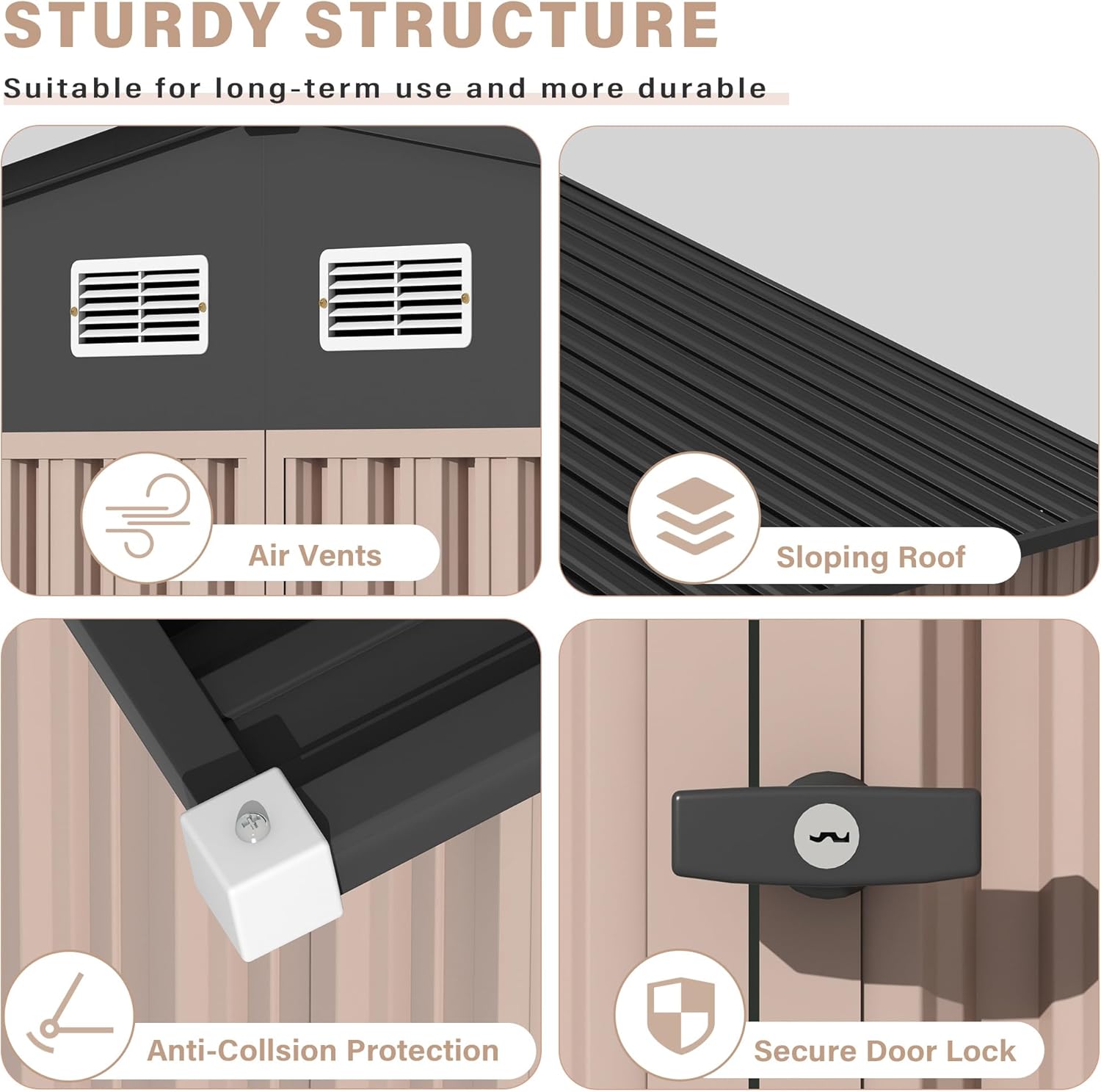 • SLOPED ROOF & LOCKABLE DOOR & AIR VENTS - The sloped roof is designed to let rainwater flow out quickly. The lockable doors can enhance security and prevent strangers or small animals from entering accidentally. The design of air vents can effectively improve air circulation and prevent your items from getting moldy and damaged in humid and hot summers. Plastic protective caps are provided for the sharp corners of the ceiling and each screw to prevent injuries during construction or use