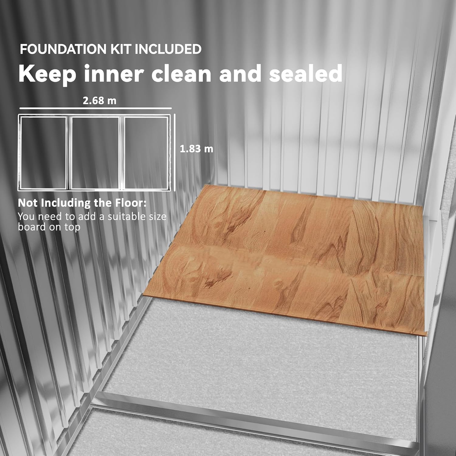 • Weather Ready: This metal shed has a water-safe galvanized steel frame, which makes it great for year-round outdoor use. It also has a foundation kit, which enhances stability by itself or keeps the space clean and sealed as a floor with the help of some wood boards.
