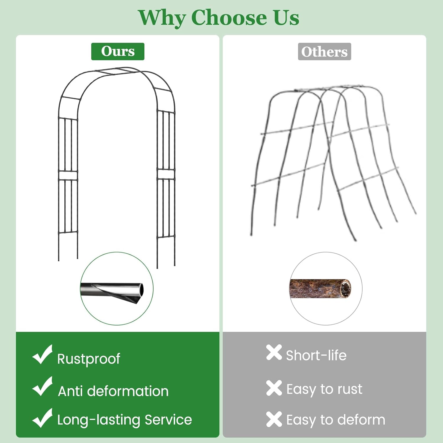 • Wide Application: This garden archway provides ample space for a variety of climbing plants, such as morning glory, Chinese roses, ivies, grapes, tomatoes, and more. Whether you're looking for an indoor decoration or add a touch of greenery to your garden, courtyard or even wedding, this trellis is the perfect choice.