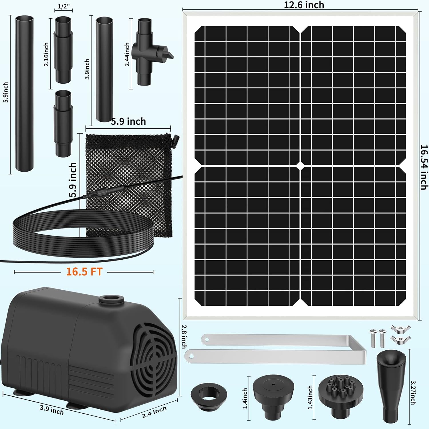 • [Easy to Use & Wide Application] The solar fountian pump is solar-powered, no need run wires across your yard and no electric bills, it starts running once pointed at the sun. Perfect for use in ponds, fountains, pools, waterfalls, hydroponic, irrigation systems and water features. The solar pump comes with mounting bracket and 16.5 ft cord length giving you flexibility in mounting.