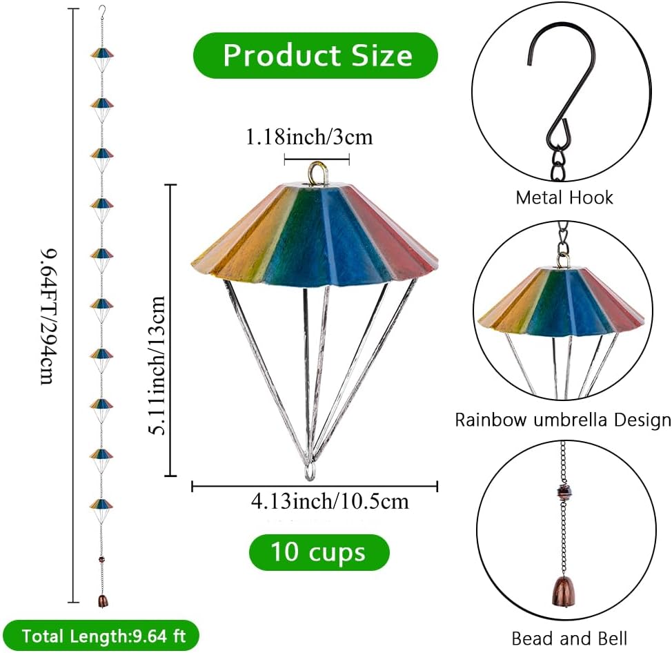 • Rainbow Rain Chains: This rainbow rain chain is made up of 10 rainbow parachutes, the total length is 9.7 FT/295 cm, this adjustable length rain chain is perfect for standard one-story buildings, you can adjust the length of the rain chain according to the height of your house. It will add a splash of color to your life and let you see a bright 'rainbow' even on a rainy day