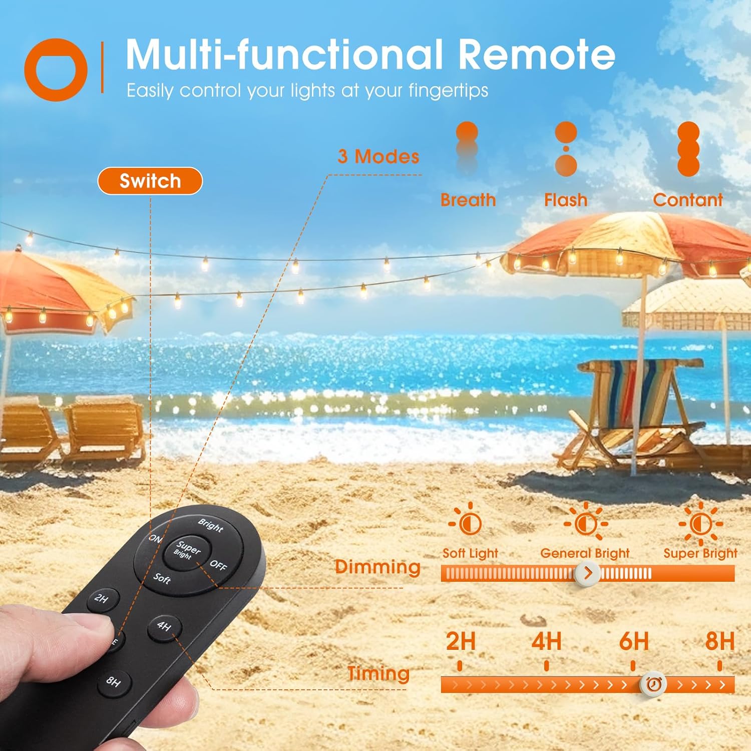 • UPGRADED! Remote Control: Intelligent remote control well integrates convenience and humanization, defining a new generation solar string lights. 3 Brightness Mode: Soft/Bright/Super bright. 3 Light Mode: Breathing/Flashing/Constant. 4 Timing Control: 2/4/6/8 Hrs. There is no need to buy an additional timer, making saving energy and saving power so simple and easy