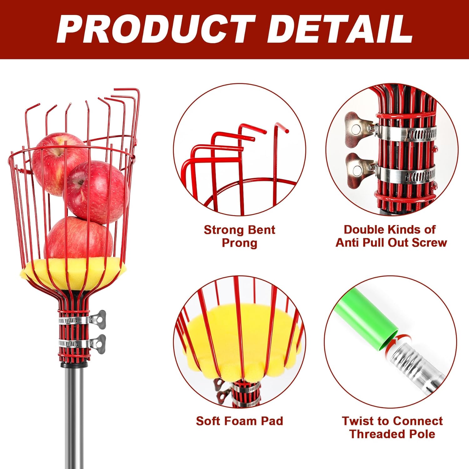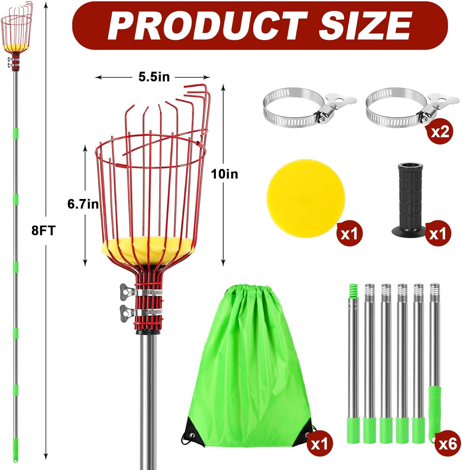 • 8FT Fruit Picker with Basket - This fruit picker tool is equipped with a large-capacity metal basket with a diameter of 5.5 inches, along with 6 assembly poles, a sponge pad, and a green storage bag, protecting fruits from damage while also making it convenient to carry them. It is suitable for picking fruits with diameters ranging from 1.25 to 5.5 inches.