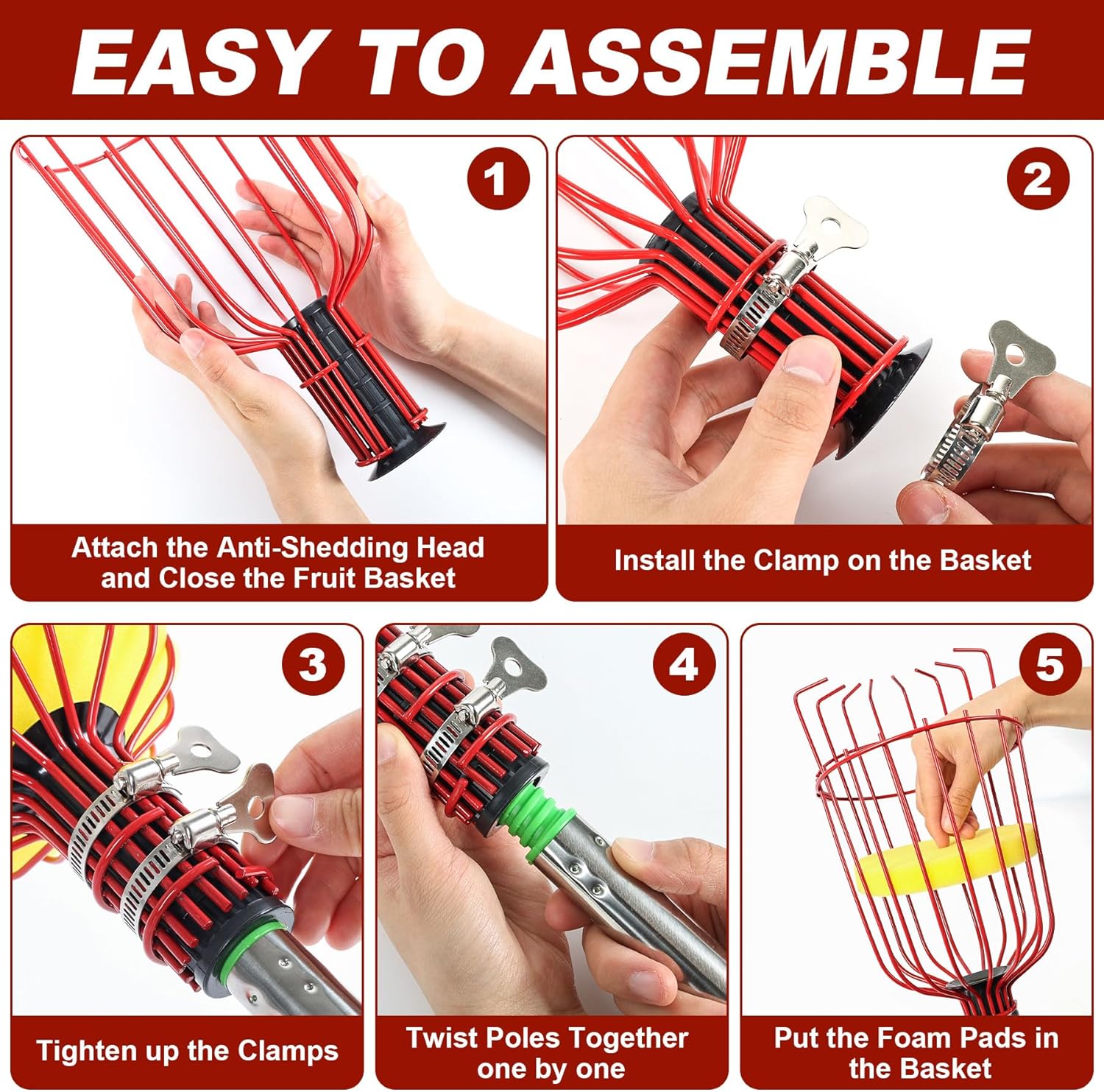 • Easy to Install - First, rotate and tighten the required number of poles, then assemble the fruit basket head and anti-fall head together, and finally rotate the two metal clips to fix the fruit basket on the pole. No additional tools are required, and you can also adjust the length by adding or reducing some poles to meet different height fruit picking needs.