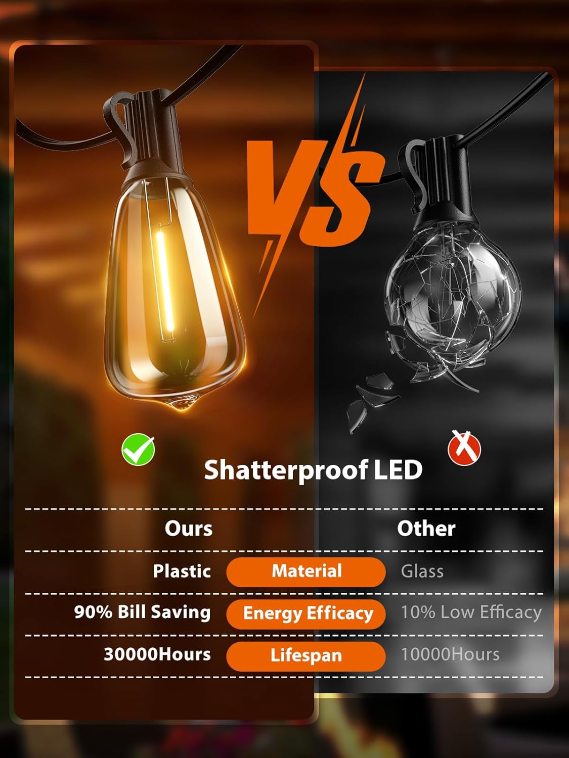 • 【Weatherproof and Shatterproof】IP65 Waterproof led string lights can withstand cloudy, damp, windy, foggy, rainy, snowy, or extreme temperatures,This making it ideal for year-round use in outdoor spaces like patios, gardens, and bistros, creating a festive and inviting atmosphere.Besides, these led bulbs made from unbreakable PET material and hard anti-drop plastic shells,This ensures the safety of your family, as there is no risk of broken glass shards while hanging these backyard lights