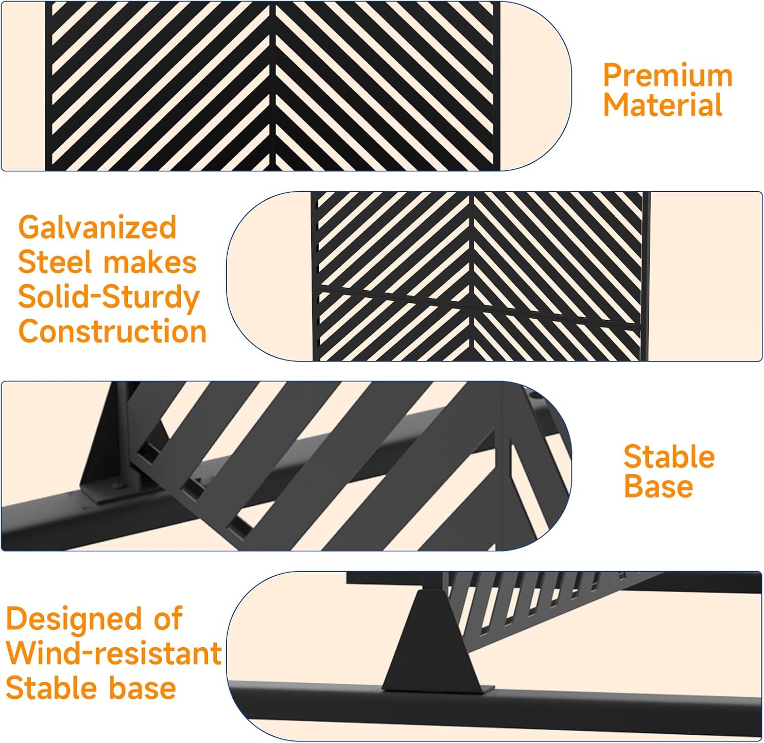 • Durable Construction: Built with thickened steel and a powder-coated finish, our metal privacy screen is designed to resist sun damage and water, ensuring longevity and durability. Ideal for withstanding varied weather conditions, from intense sun to heavy rain, without rusting or fading.