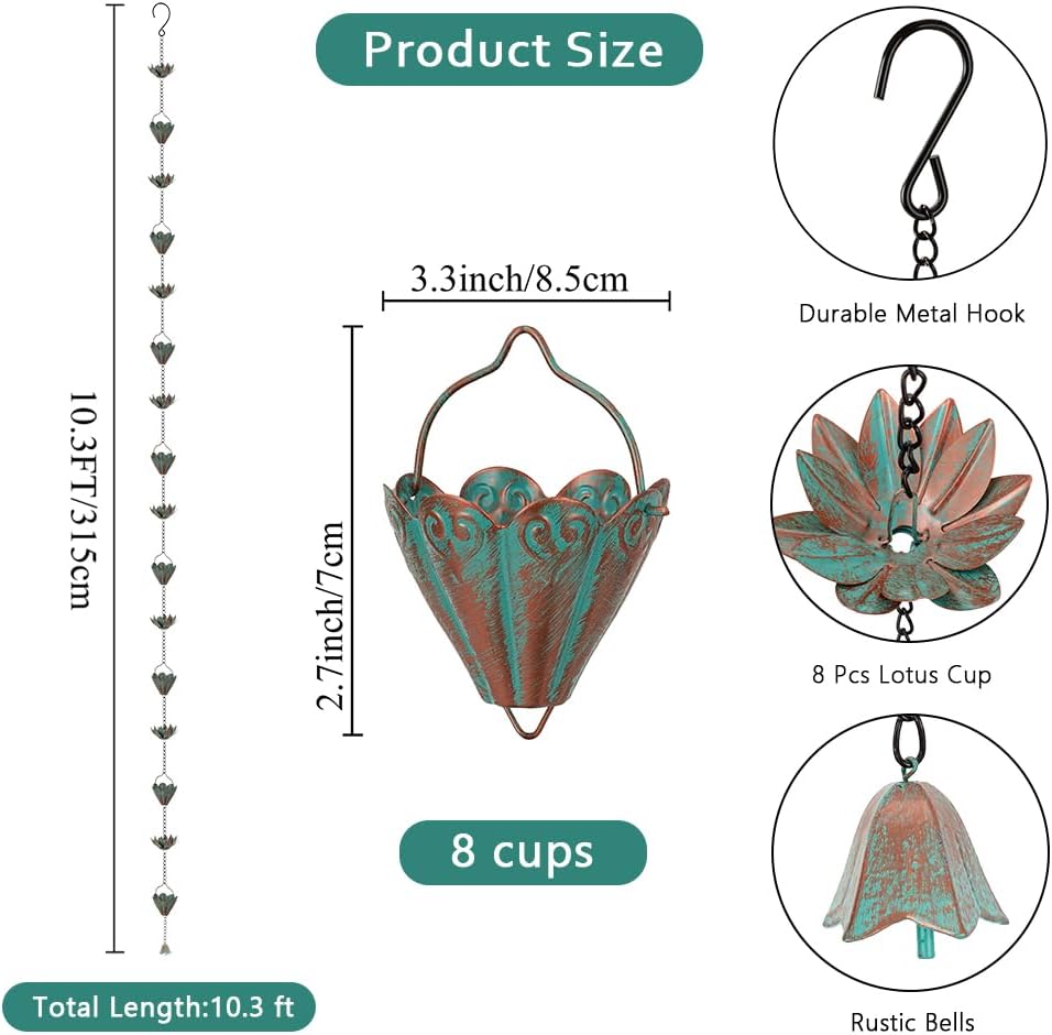 • Artistic Atmosphere: The rain chain for gutters consists of 16 vintage lotus cups. As rainwater trickles down the chain, give the quiet courtyard an elegant and unique beauty