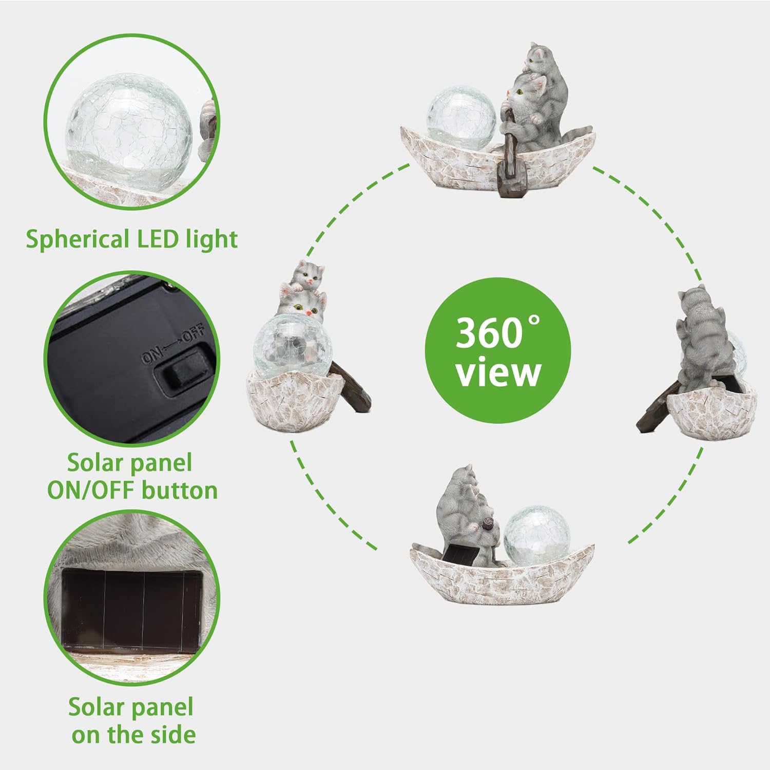 • 【Easy To Use】The patio Cat ornament which just toggle the bottom switchand leave it in the "on" position in the daytime.The solar Cat sculpture charge during the day and light up automatically at night.If the led lights don't turn on when you receive it that maybe caused by the long time shipping.Just place Cat in the sunlight for a few hours,and the problem will be fixed.