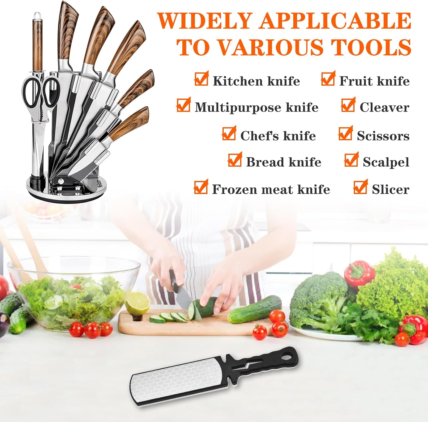 • 5 in 1 Sharpening Stone:The front side 400# coarse sharpening is used to repair severely dulled blades, and back side 1000# fine sharpening is used to re-sharpen the edges and deburr the blade. The lightning slot in middle of handle is for Scissors Grinding. Left waist of the handle is tungsten steel blade sharpens to restore the knife's V-shape,and the right waist of the handle is ceramic blade sharpens for polish and eliminates burrs on the metal blade.