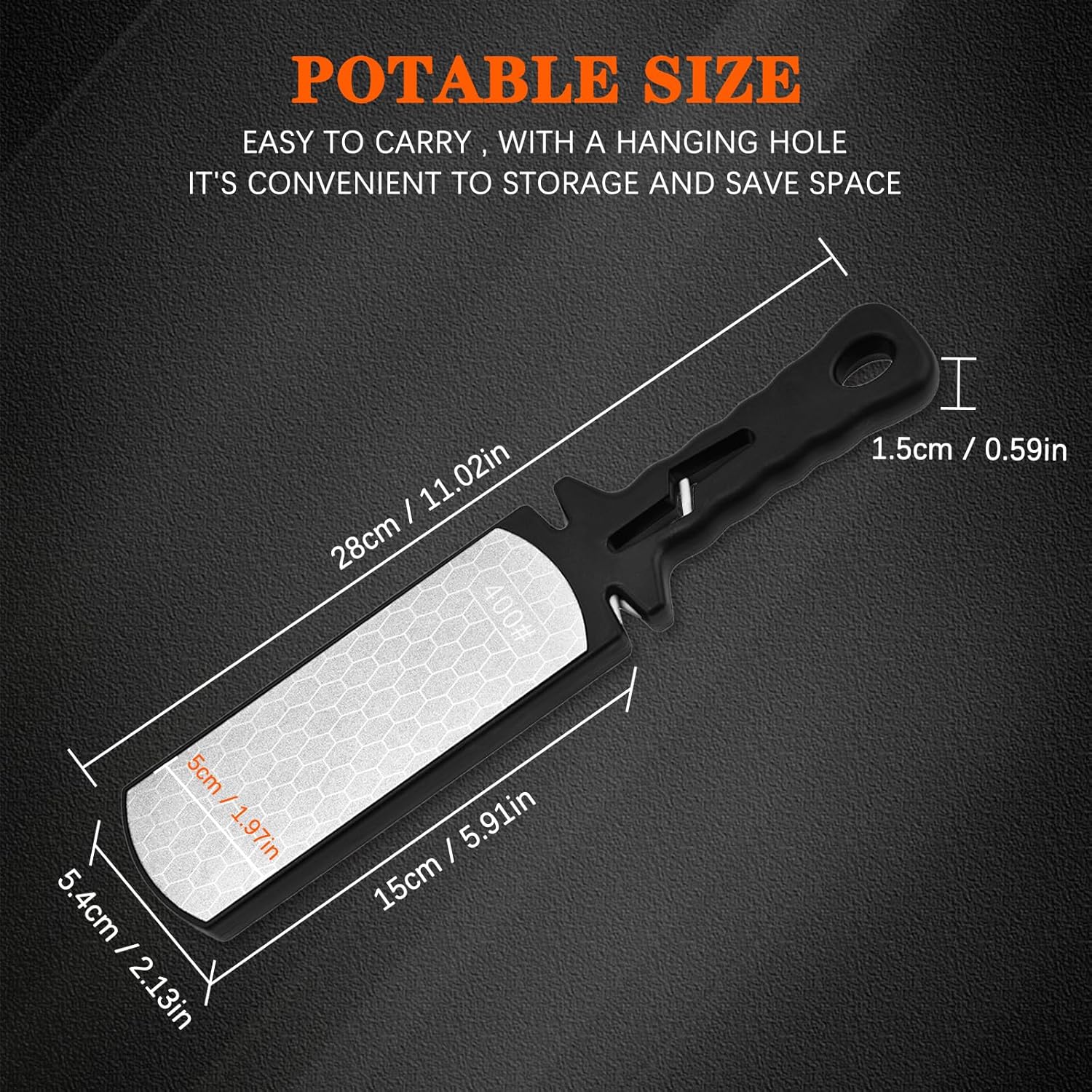 • 5 in 1 Sharpening Stone:The front side 400# coarse sharpening is used to repair severely dulled blades, and back side 1000# fine sharpening is used to re-sharpen the edges and deburr the blade. The lightning slot in middle of handle is for Scissors Grinding. Left waist of the handle is tungsten steel blade sharpens to restore the knife's V-shape,and the right waist of the handle is ceramic blade sharpens for polish and eliminates burrs on the metal blade.
