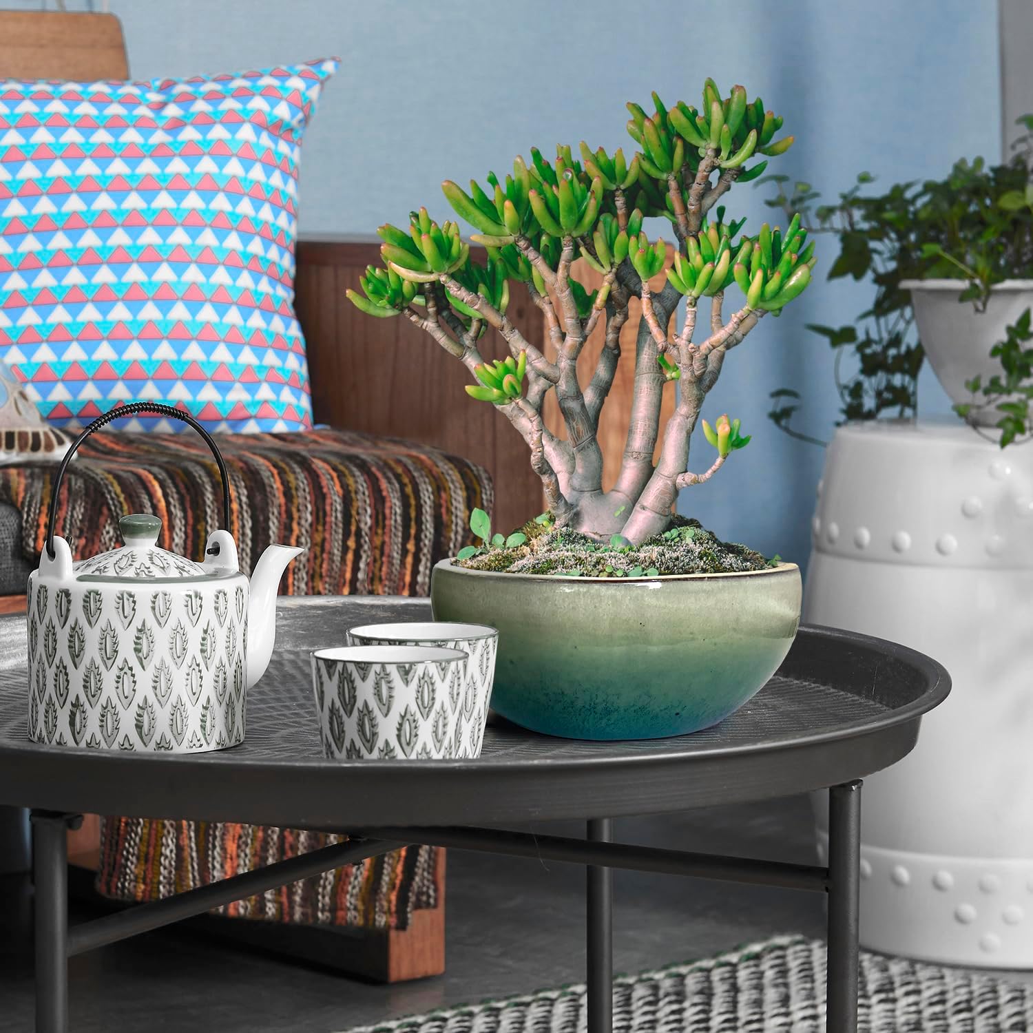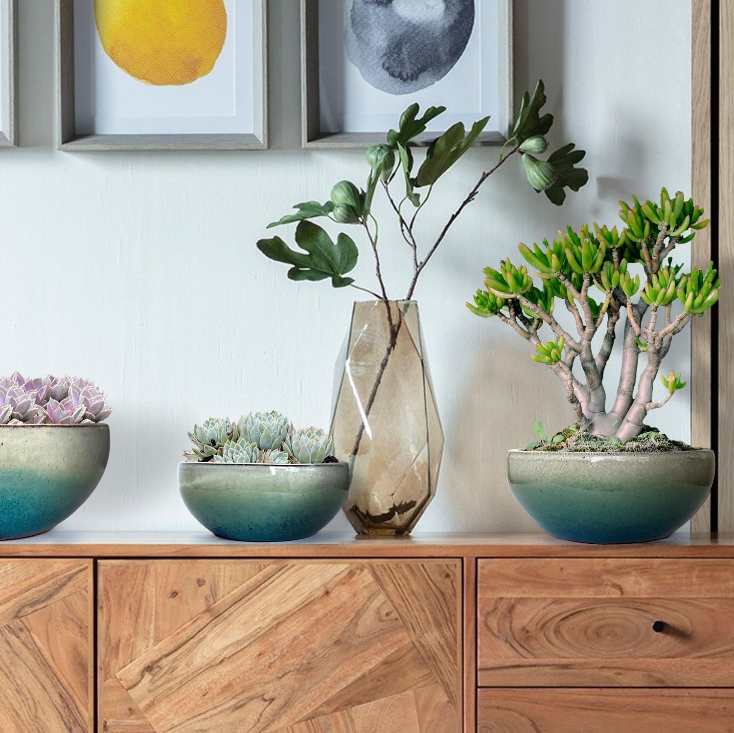 11 9 7 Inch Succulent Pot with Drainage and Mesh Pads Large Round Ceramic Plant Pot for Indoor Outdoor Plants Succulent Planter Cactus Bonsai Pot Container Set of 3 (White Green)