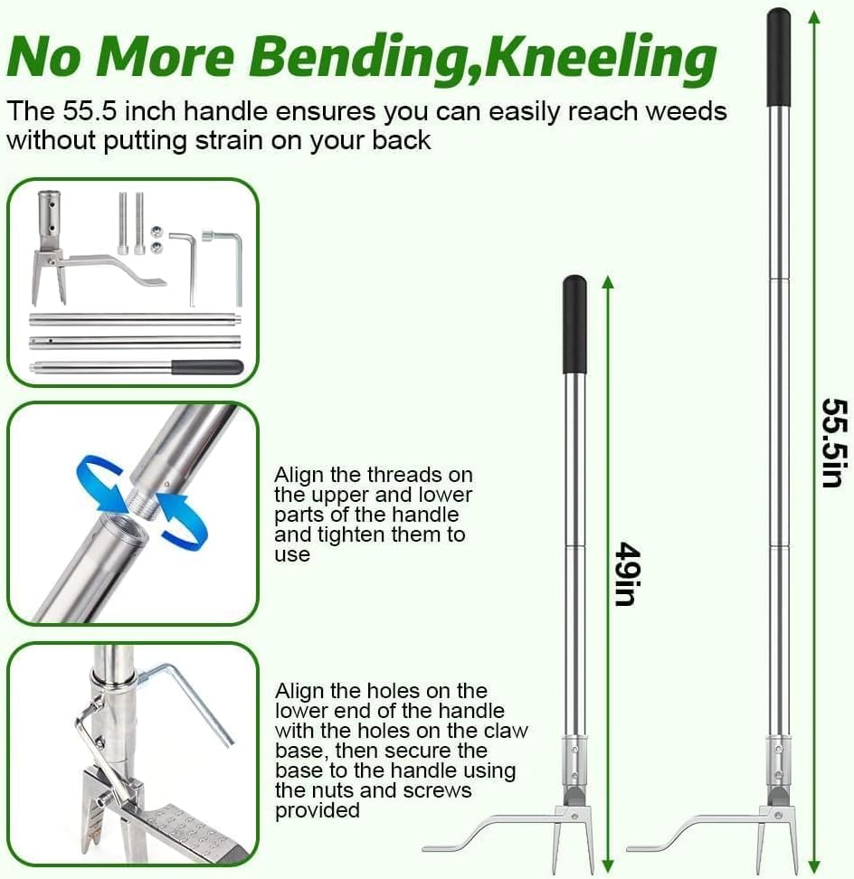 • 55.5 Inch Ergonomic Handle: The 55 inch weed puller tool stand up heavy duty is designed for users with back/joint issues, the handle consists of 3 parts and is adjustable in size 49"/55" to match your height and reduce pressure, allowing you to stand while weeding. The lightweight and sturdy structure reduces pressure on the joints, making it ideal for users with sensitive backs or mobility issues