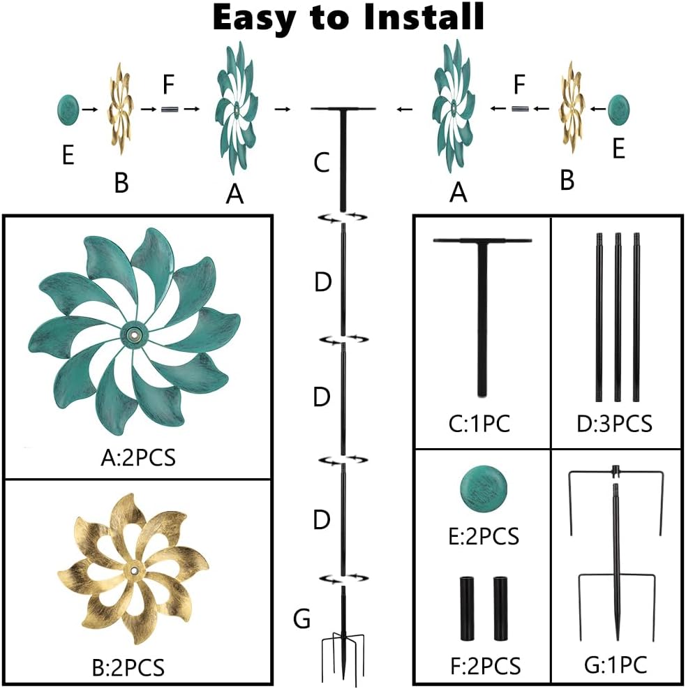 • Friendly Installation: The components of the metal wind spinner are connected in a spiral manner. The prong stakes are designed to be stable and easy to place, allowing the outdoor wind spinner to be quickly fixed in any ideal position in your garden