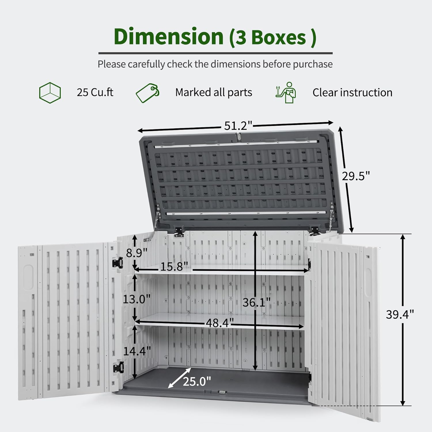 • Plastic Shed: Overall Dimension: 52.16 (W) x 28.34 (D) x 38.58 (H) inch; Internal Dimension: 48.43 (W) x 25.00 (D) x 36.10 (H) inch