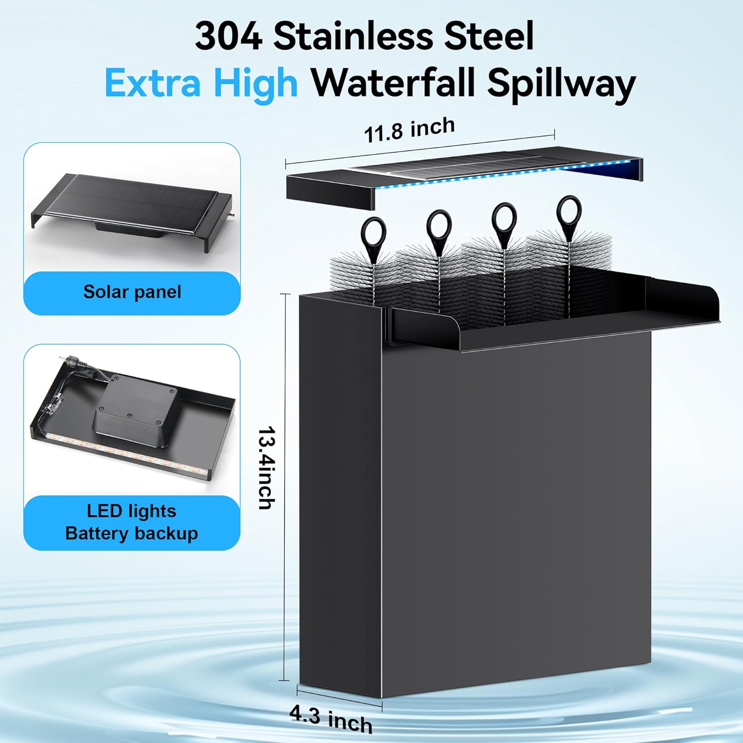 • 【High-quality 304 Stainless Steel】Pond Waterfall box Adopts 304 stainless steel is carefully crafted to be corrosion-resistant and oxidation-resistant to ensure that it doesn't rust or deform in long-term use, and it is fearless of erosion by wind and rain and lasts for a long time. Its strong and durable characteristics, so that the waterfall bucket can work in the outdoor in a durable and stable, enhance the overall decorative effect.