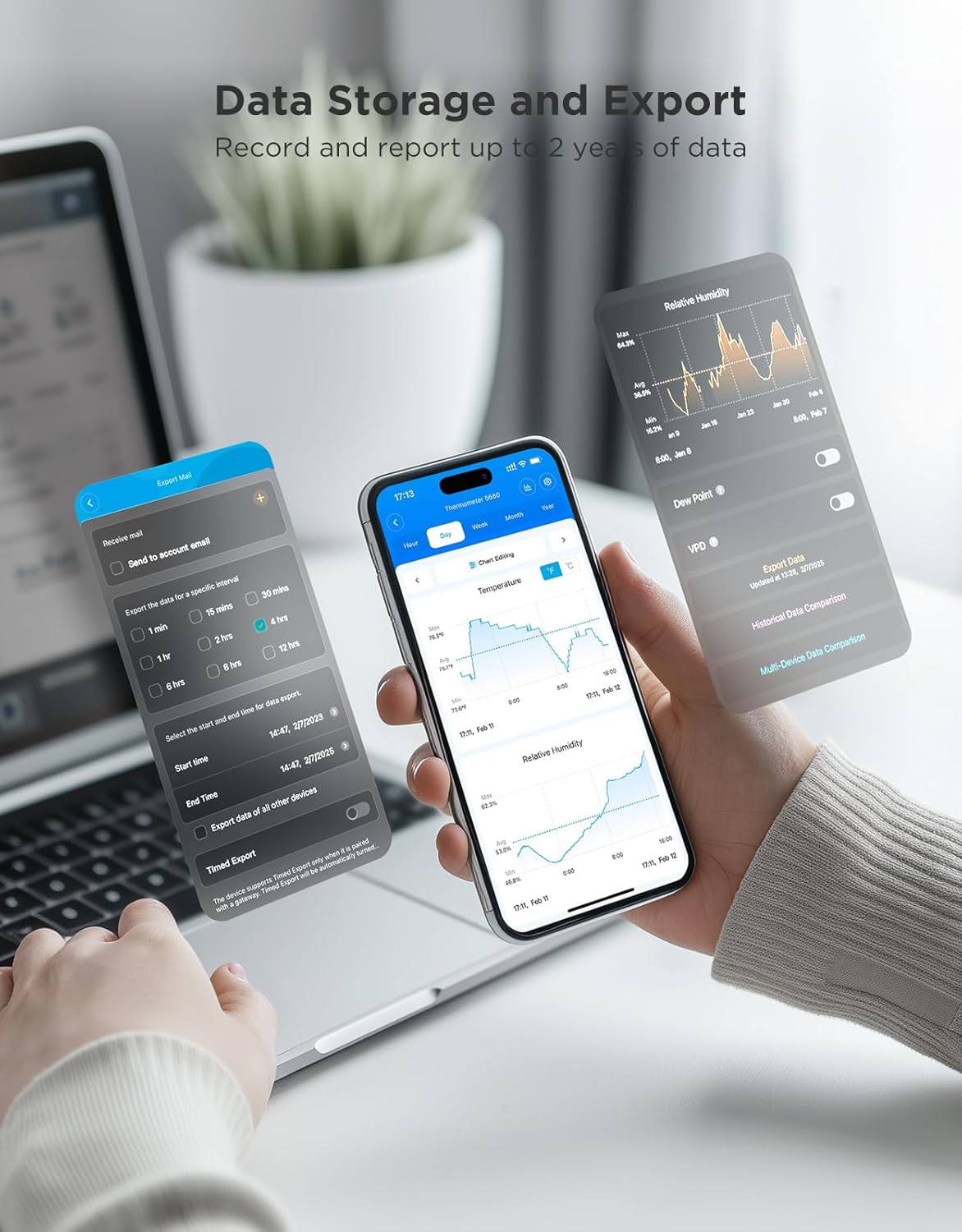 • Data Storage & Export: This bluetooth hygrometer thermometer sensor uploads data to the app via bluetooth. View the temperature and humidity trend chart from the past 20 days and export data from the past 2 years. Ideal for greenhouses, farms, etc.