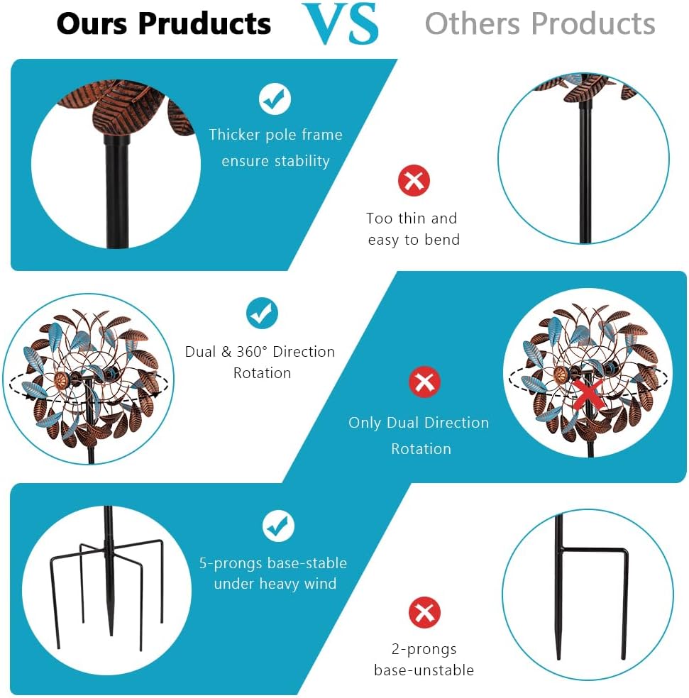 • 【Yard Art Pinwheels】The height of wind spinners for yard and garden is 63.4”, with a diameter of 13”. The brown and blue blade design allows windmills to better integrate with nature, and the entire kinetic wind spinner has been treated with anti-corrosion and rust prevention, making it more suitable for outdoor use.