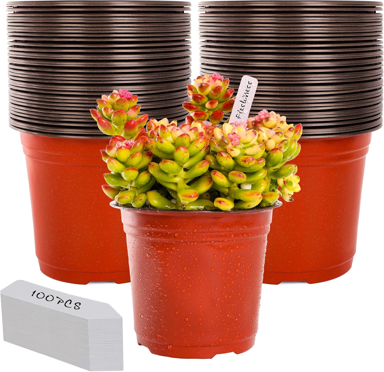 TDHDIKE 6 Inch Plastic Plant Nursery Pots (100pcs Pots and 100pcs Plant Labels) Seedling Flower Plant Container (Red) Seed Starting Pots Indoor/Outdoor