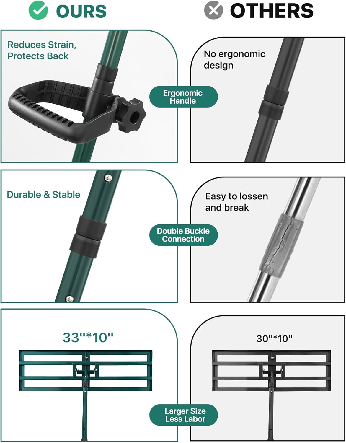 • Ergonomic Handle: Ergonomic handle of lawn leveler is designed for comfort and efficiency. Ergonomic handle reduces strain on your hands, wrists, and shoulders, preventing fatigue and improving control, even in wet or muddy conditions. The handle encourages a natural, upright posture, minimizing back pain and allowing for longer, more comfortable use. making lawn leveling faster and less physically demanding