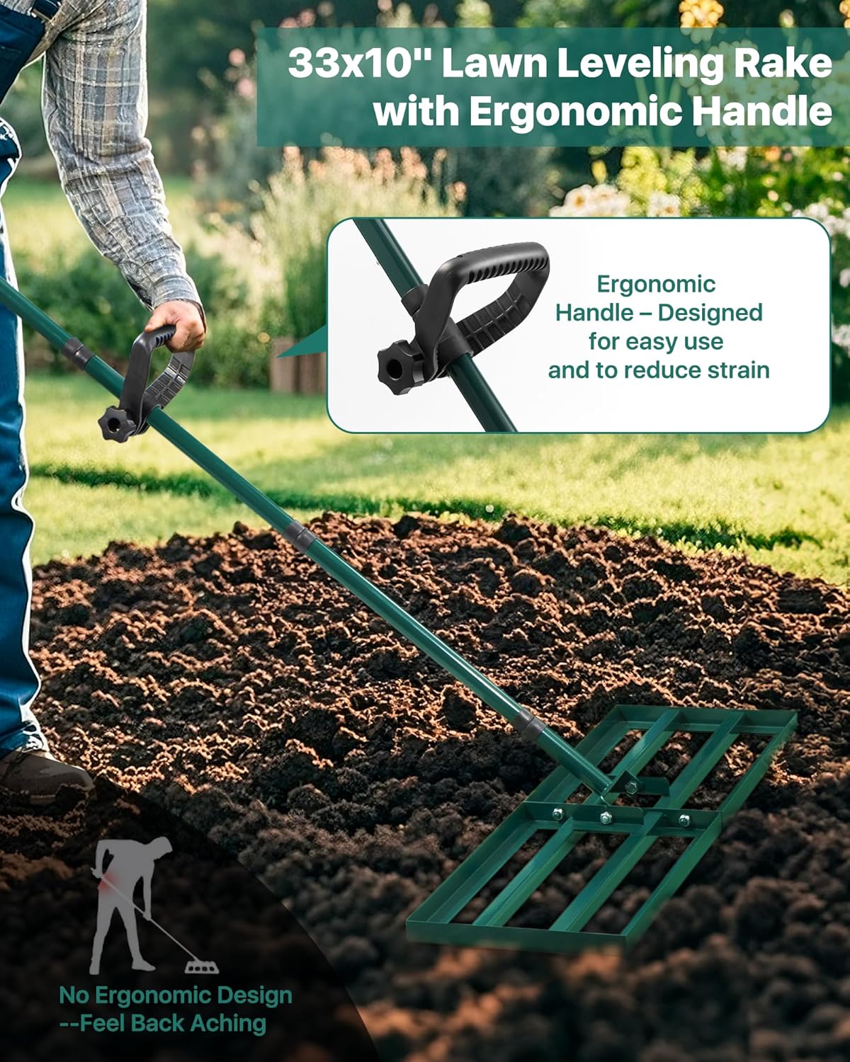 • Upgrade Structure & Multi-Function: 33x10'' lawn Leveling Rake is designed to tackle a variety of garden tasks, including distributing application materials, removing stones, breaking up small clods of sand or loam, mixing soil with fertilizers, and smoothing the soil for effortless planting. Mutil-function lawn rake makes planting and gardening much easier