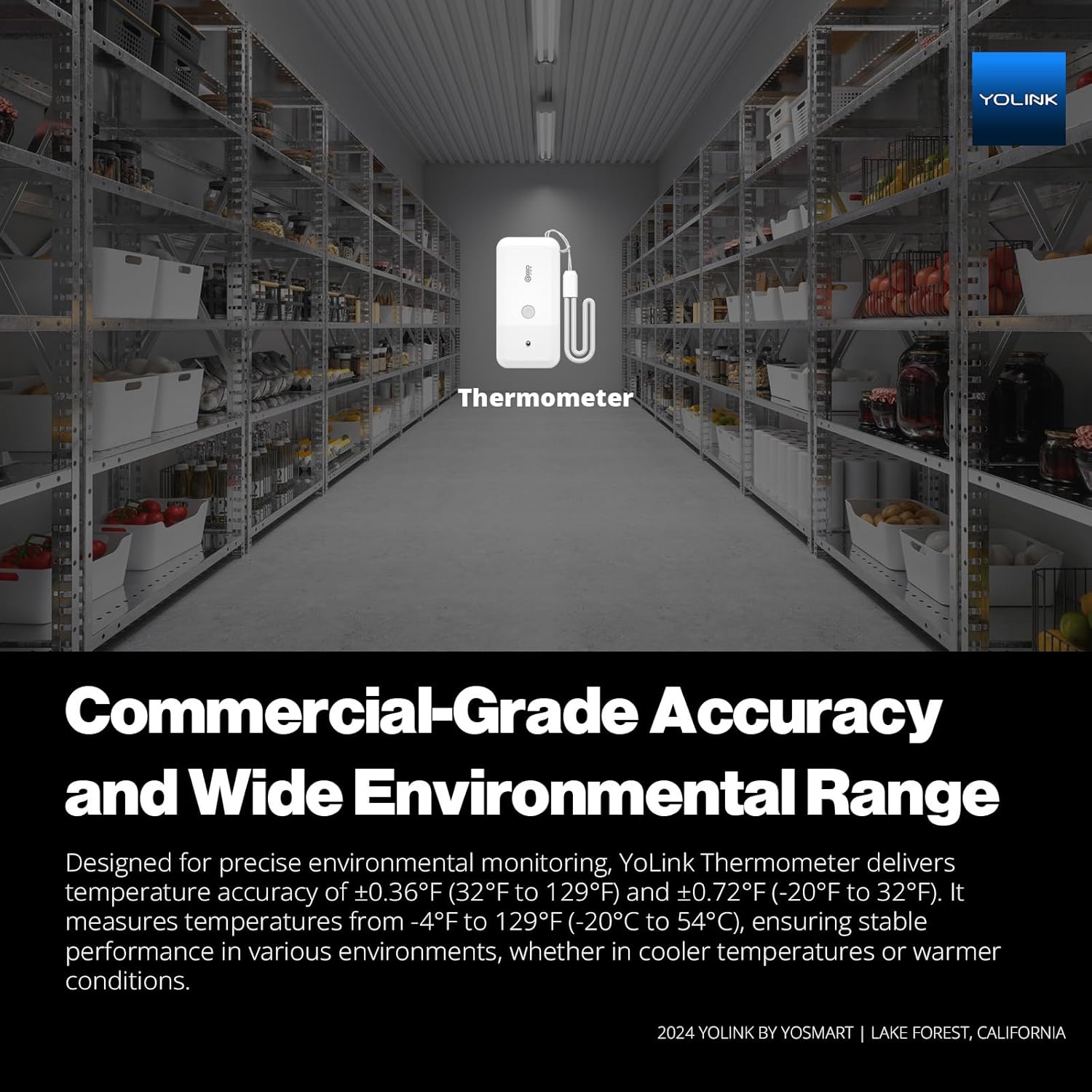 • Commercial-Grade Accuracy and Wide Environmental Range: Designed for precise environmental monitoring, YoLink Thermometer delivers temperature accuracy of ±0.36°F (32°F to 129°F) and ±0.72°F (-20°F to 32°F). It measures temperatures from -4°F to 129°F (-20°C to 54°C), ensuring stable performance in various environments, whether in cooler temperatures or warmer conditions.