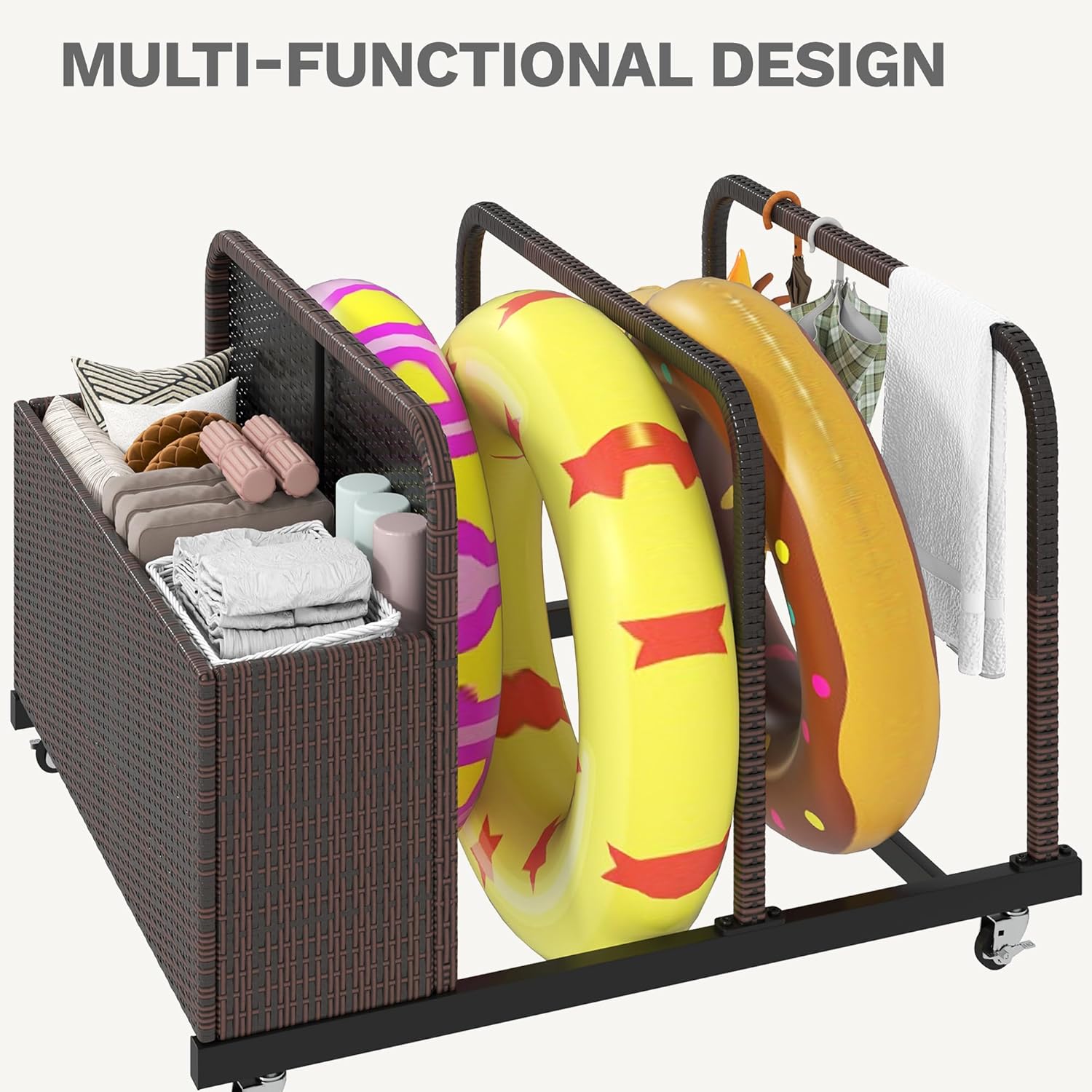 • Multi-faceted applications- Serving as a great organizer for indoor or outdoor spaces, this rattan pool toy storage cart easily brings pool noodles, life jackets, squirt guns to your swimming location.