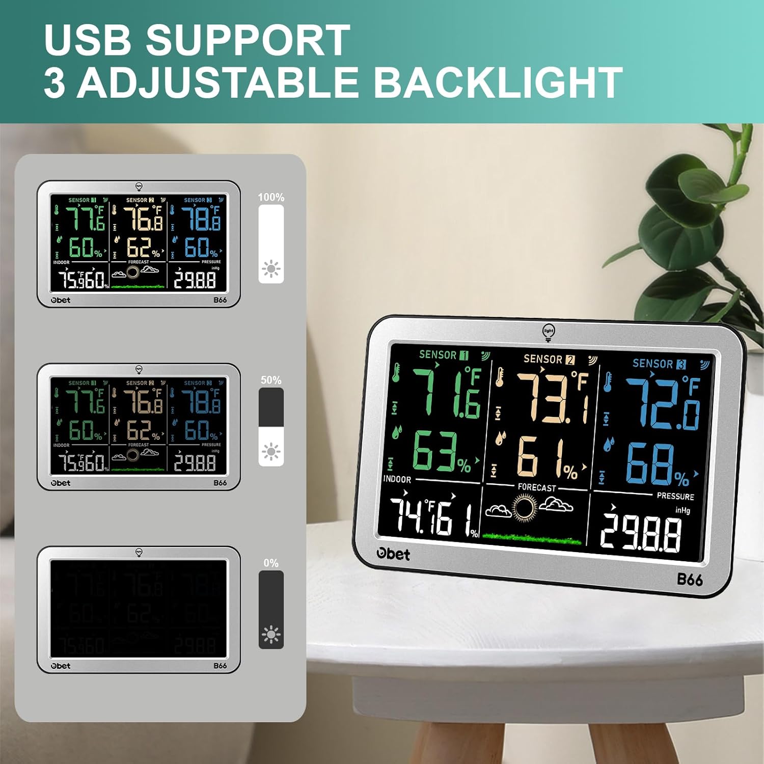 Weather Stations with 3 Sensors Indoor Outdoor Thermometer Wireless Large Display Adjustable Backlight with 500 feet Range Silver