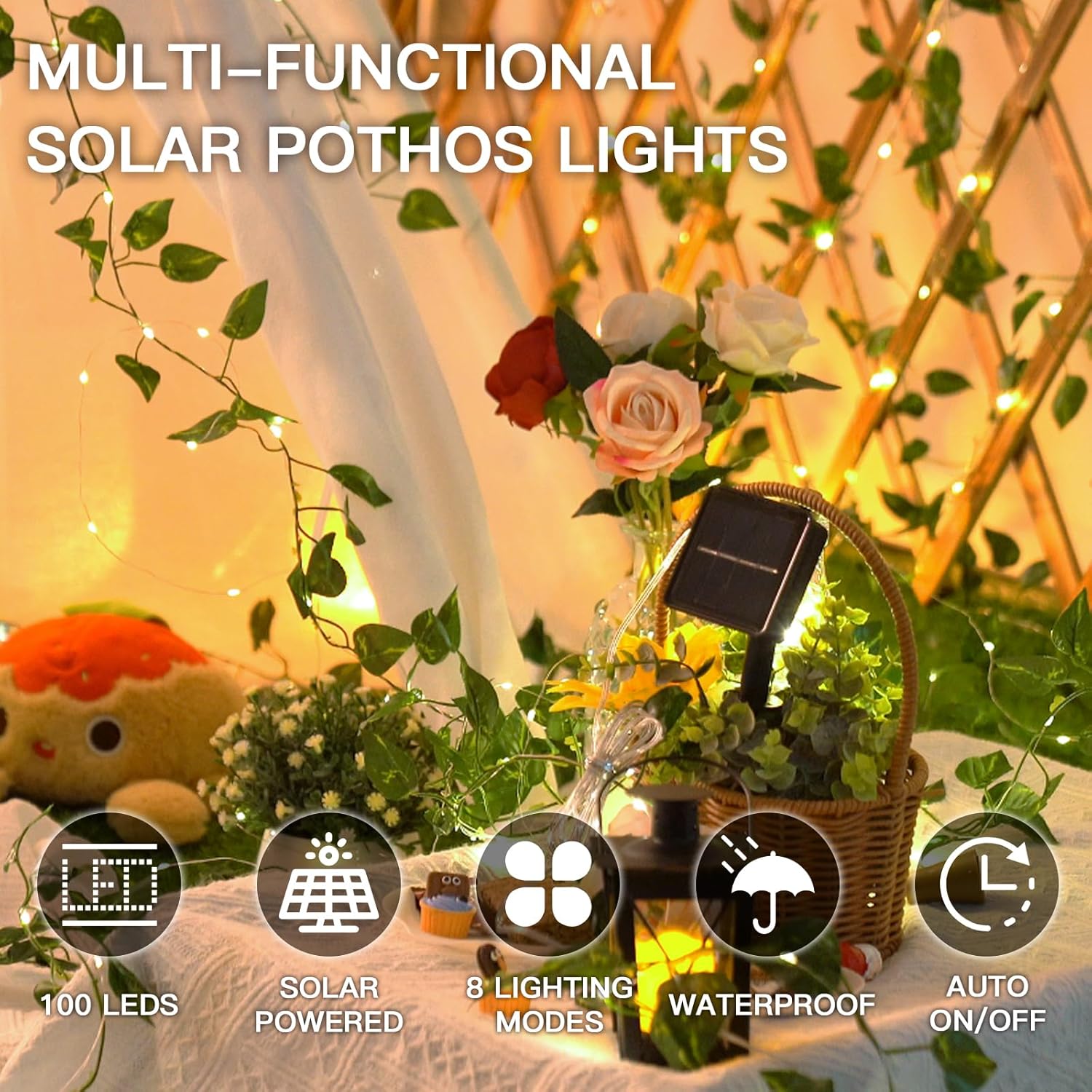 suddus Solar Fairy Lights, 33ft 100 Led Pothos Leaf Solar String Lights Outdoor Waterproof, 8 Modes Vines with Lights for Balcony, Deck, Patio, Garden, Fence,Wedding (Warm White)