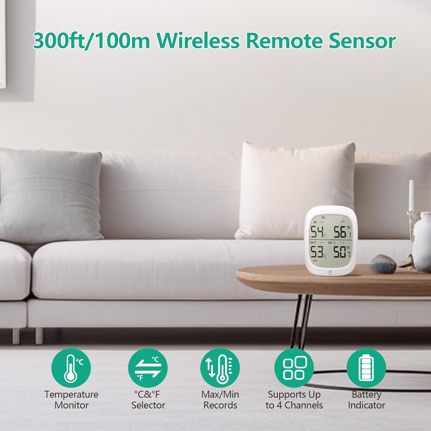 • ๐Ÿฏ๐Ÿฏ๐Ÿฌ๐—™๐—ง ๐—ง๐—ฟ๐—ฎ๐—ป๐˜€๐—บ๐—ถ๐˜€๐˜€๐—ถ๐—ผ๐—ป: Outdoor wireless temperature humidity accurately measure temperature and humidity up to 330 ft away, can penetrate obstacles. Temperature and humidity monitor continuously transmits real-time data, such as current temperature, humidity, and battery status, to the main unit at regular intervals, providing users with robust and dependable data support.