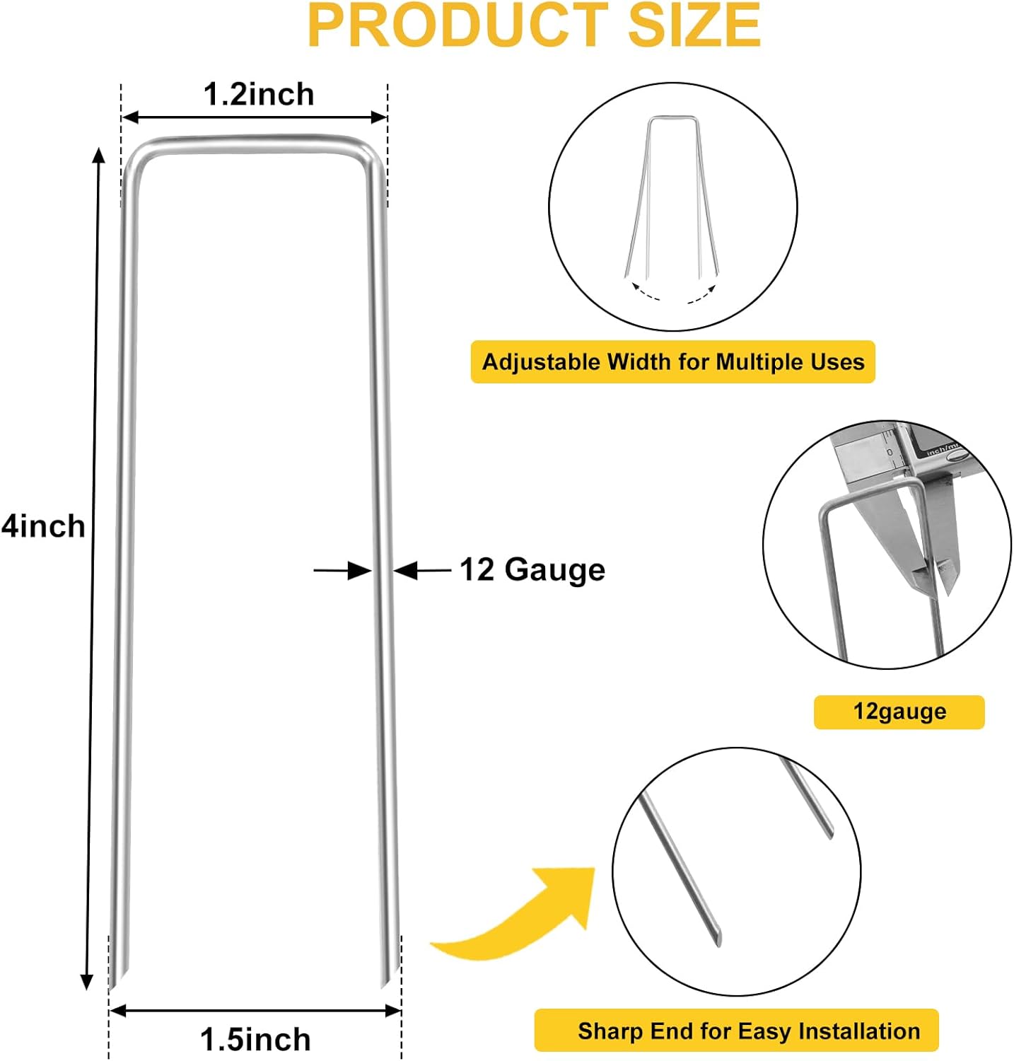 • Size:These galvanized garden staples are 4 inch long, wire diameter 12 guage; the top width is 1.2 inch, the initial bottom width is 1.5 inch.
