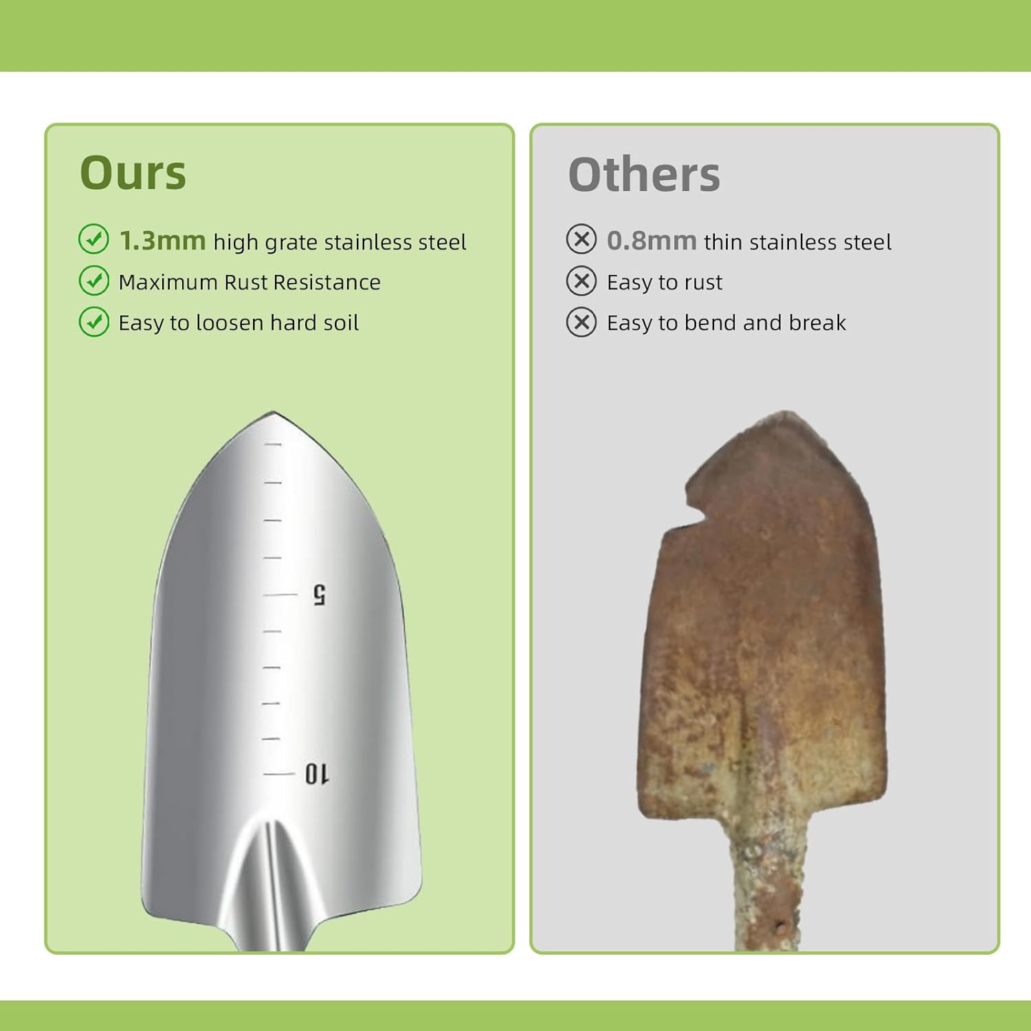 • Premium Garden Set: These gardening tools are made of high-strength stainless steel, guaranteeing corrosion resistance and rustproof for incredibly tough, sharp, and sturdy that will last a long time.