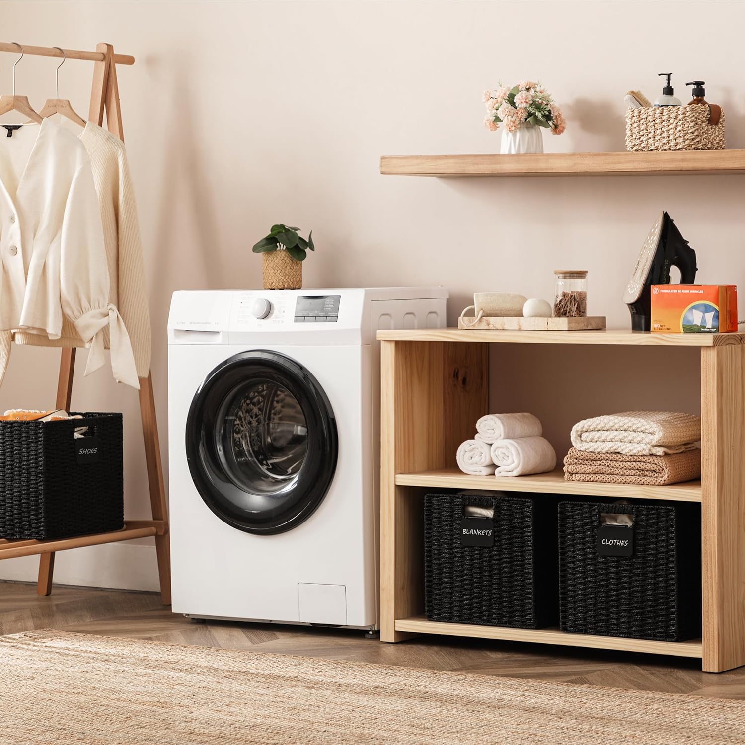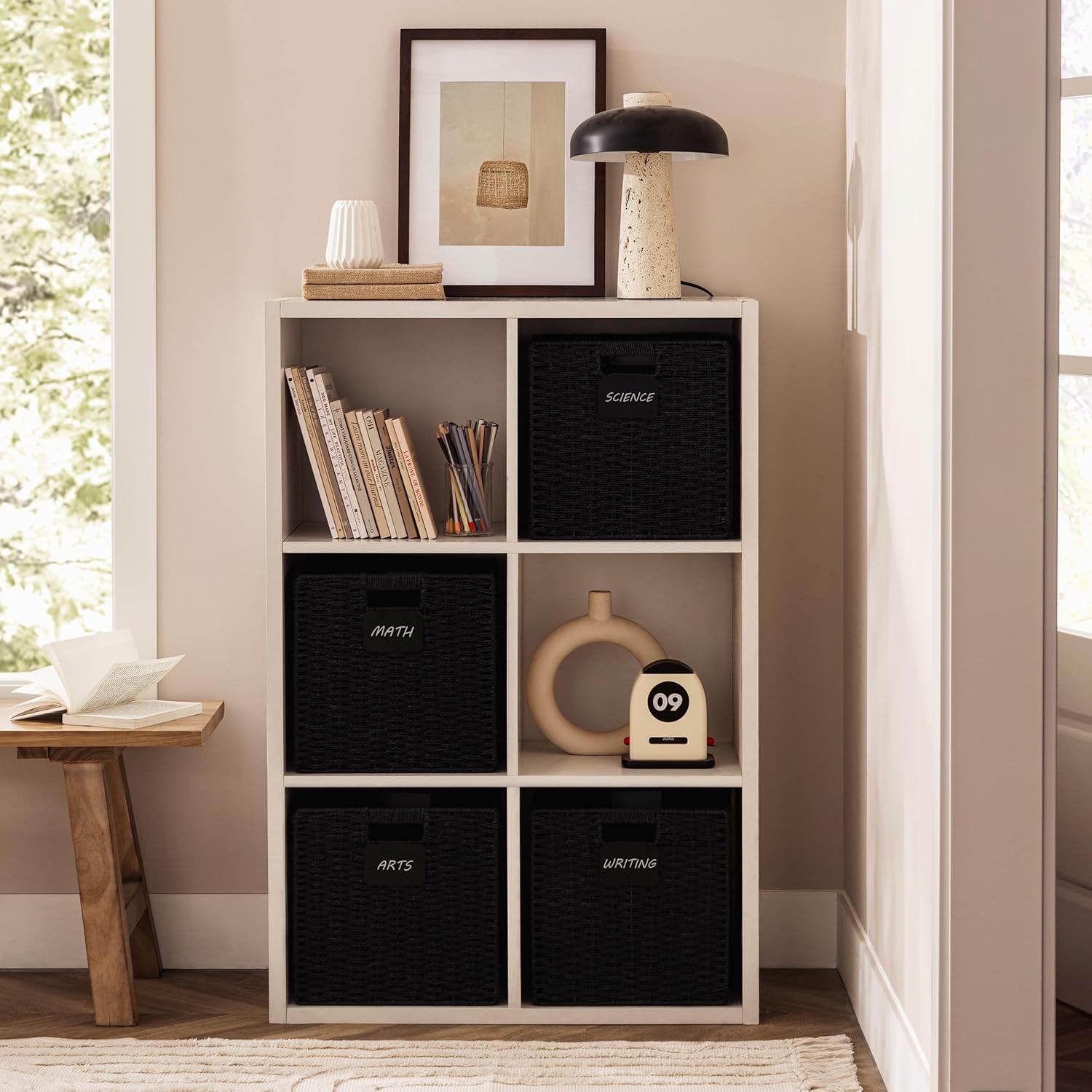 UBBCARE 4 Pack Wicker Basket, 12×12 Storage Cubes with Label, Foldable Cube Storage Bin with Handle, Square Storage Basket for Shelves, Woven Paper Rope Basket for Organizing, Black