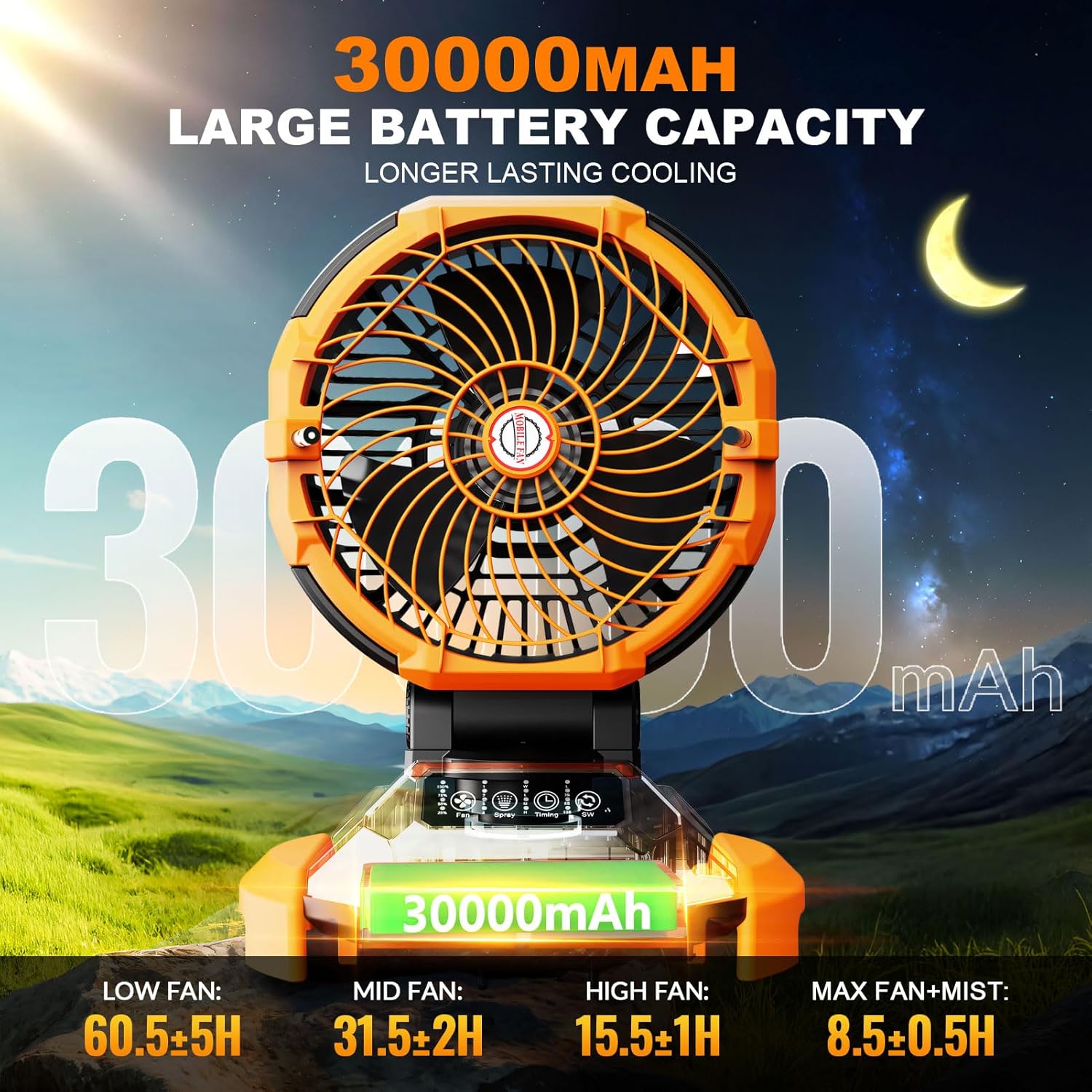 • 30000MAH HIGH CAPACITY: This battery-powered misting fan, built-in 30000mAh battery, fully charged in 5.5 hours, it can provide 6-8 hours (high fan + misting) or 15-60 hours (fan only) working time, meeting your needs for long-term outdoor and work.
