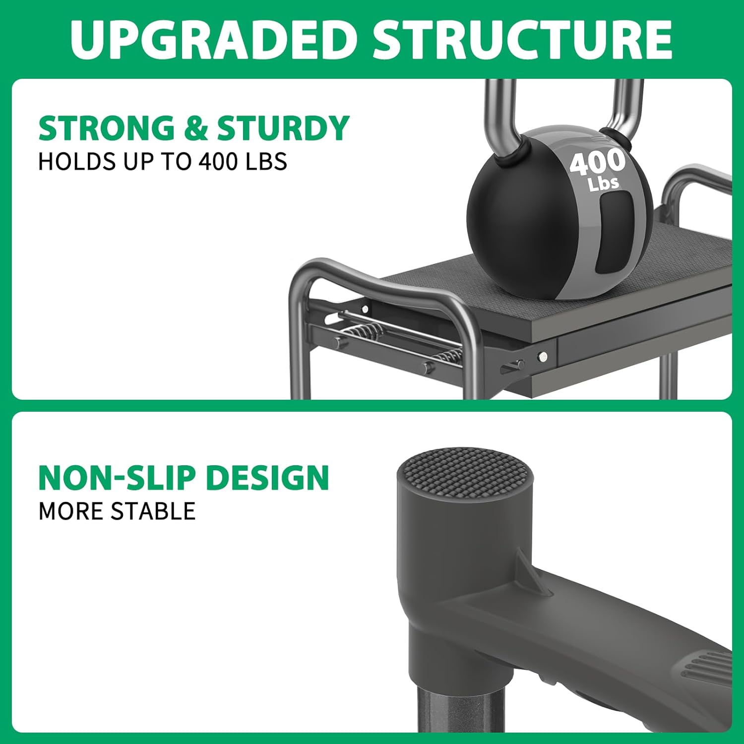 • 【MULTIFUCTIONAL GARDEN TOOLS】It is a versatile garden tool: you can use it as garden kneeler, knee on the soft kneeling pad, and it have raised handles to help get up and get down while gardening. Also, you can flip it over and use it as garden seat. The non-slip designed feet makes it more steady while sitting.