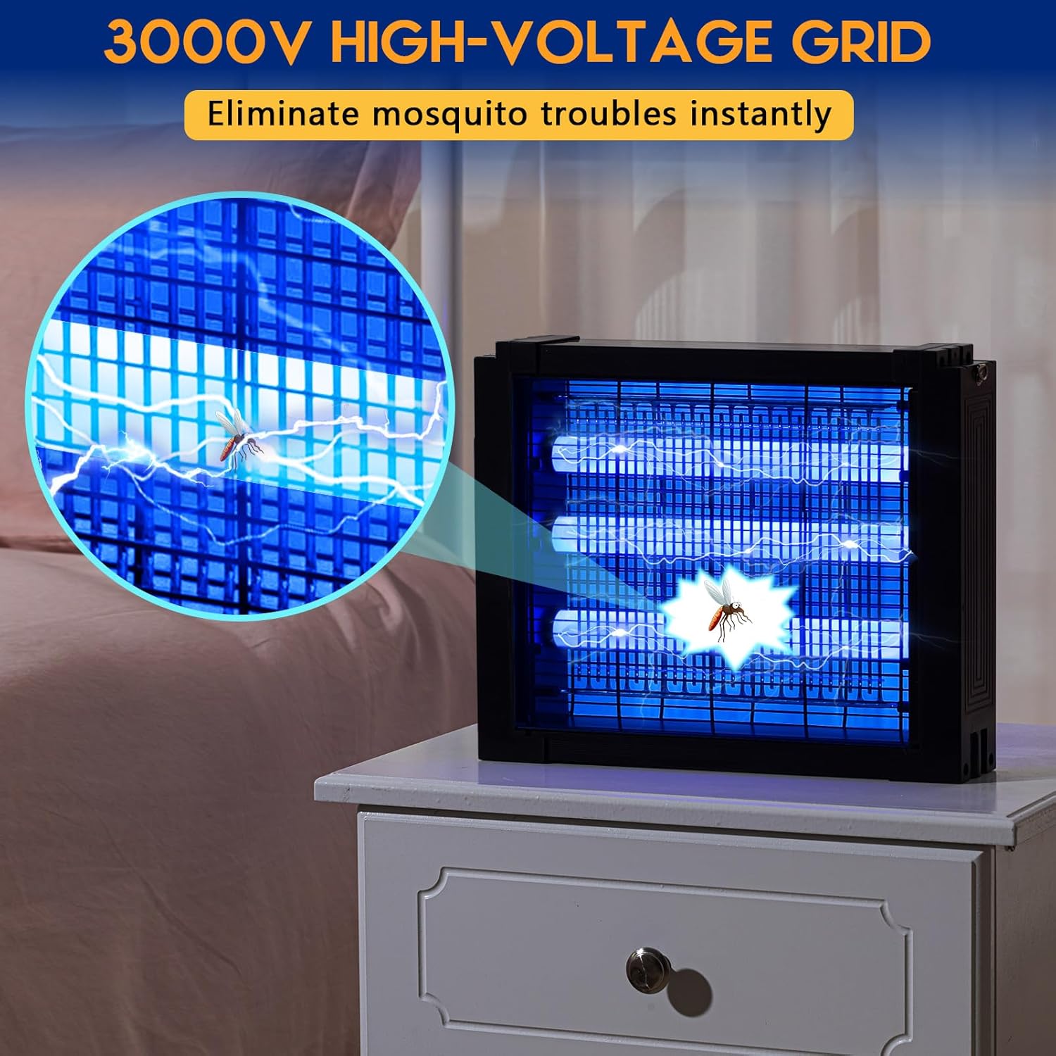 • High Performing 3000V Device: the mosquito zapper comes with a 3000V high-voltage grid; The bright blue-purple light emitted by the device instantly attracts mosquitoes and other flying insects; It provides a safe solution to keep your environment bug-free
