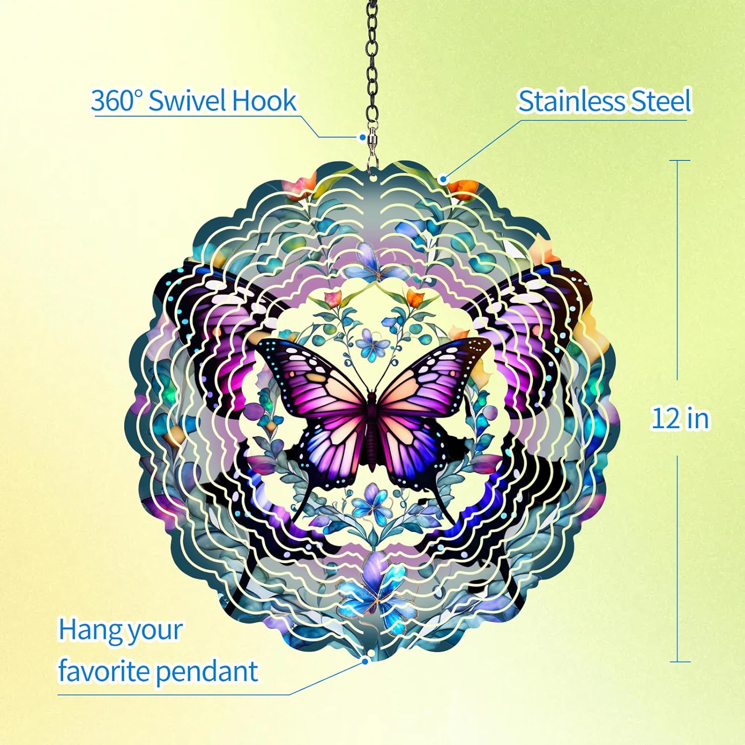 • Hanging Outdoor Wind Sculptures, butterflies wind spinners can rotate 360°, 12 inchin total diameter Includes a swivel hanging hook so wind spinner can twirl in the breeze, mandala wind spinner, whether it is hung indoors or outdoors, it can add a special fun and warmth to your life