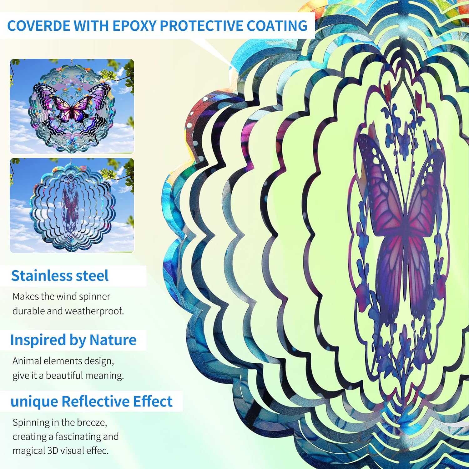 • Butterfly Wind Spinner Outdoor Garden Decor, butterfly metal wind spinner is made from Sturdy stainless steel material by laser-cutting technology to form vivid shape, makes it flexible and strong, is individually hand painted by epoxy protective coating with colorful sparkle powder inside to highly resist weather and rust. a frosted paint finish, giving off a sparkling when it spin. The unique design combined meaningful animal pattern and a 3D streamer effect.
